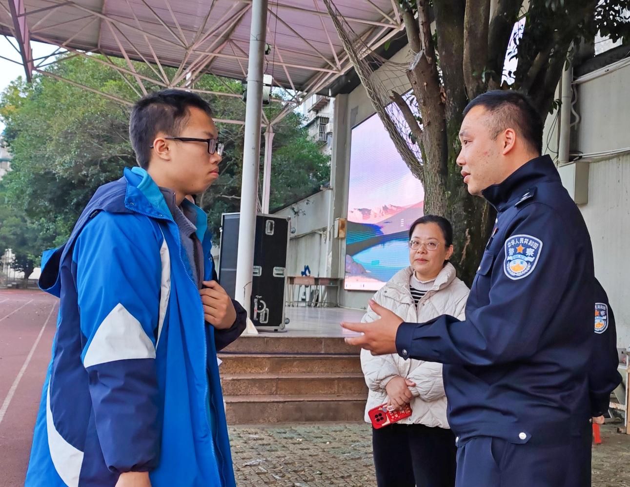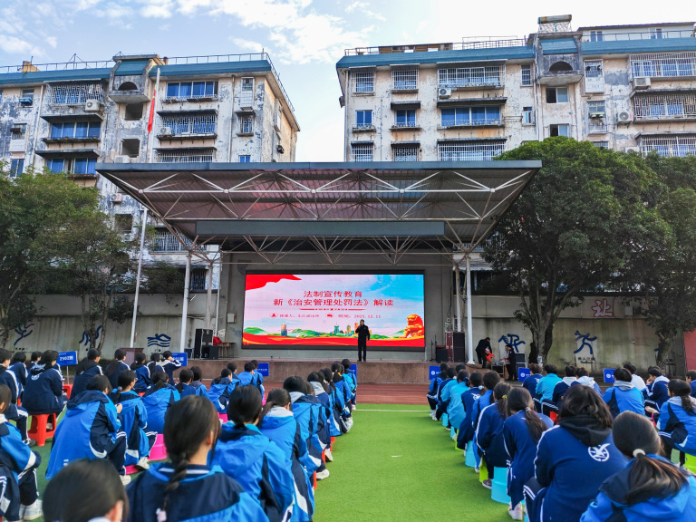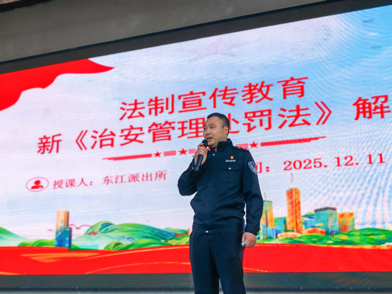 2025年12月11日,东江派出所所长蒋春晖同志、我校法制副校长东江派出所刘霁娴同志为全校师生带来了一场生动的新法解读课。