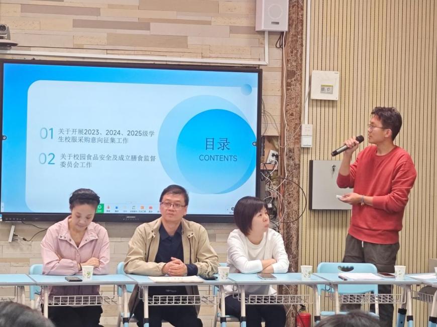 总务保卫处陈子浩老师就校服征订与供餐企业更换等家长关注事项作出说明。校服方面,他介绍了款式、材质、征订流程与费用标准,承诺将严格筛选供应商并全程监督质量。供餐方面,则详细说明了新供餐企业的遴选标准、资质审核流程,以及后续食品安全管理与菜品优化措施。
