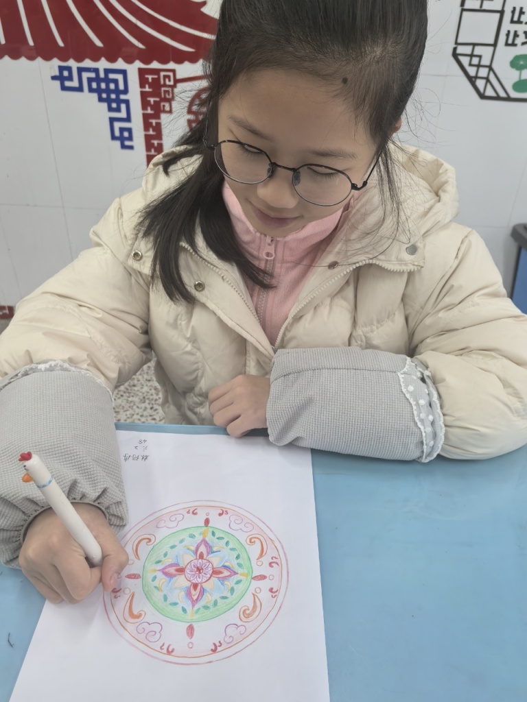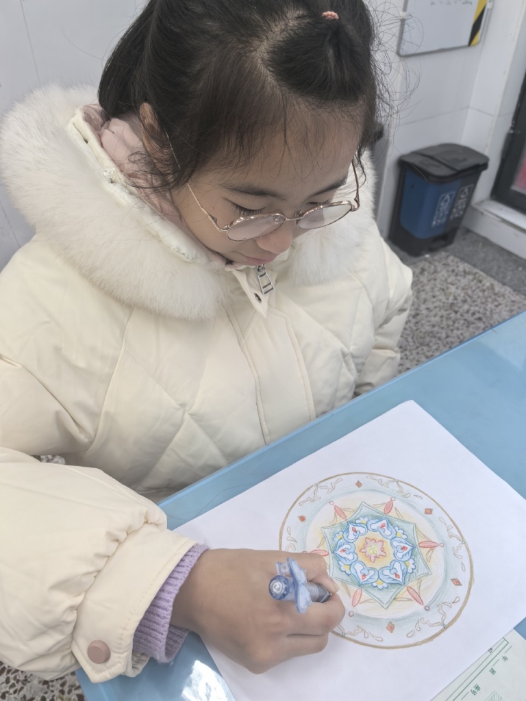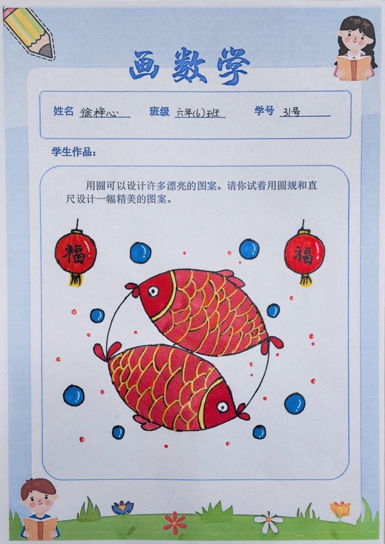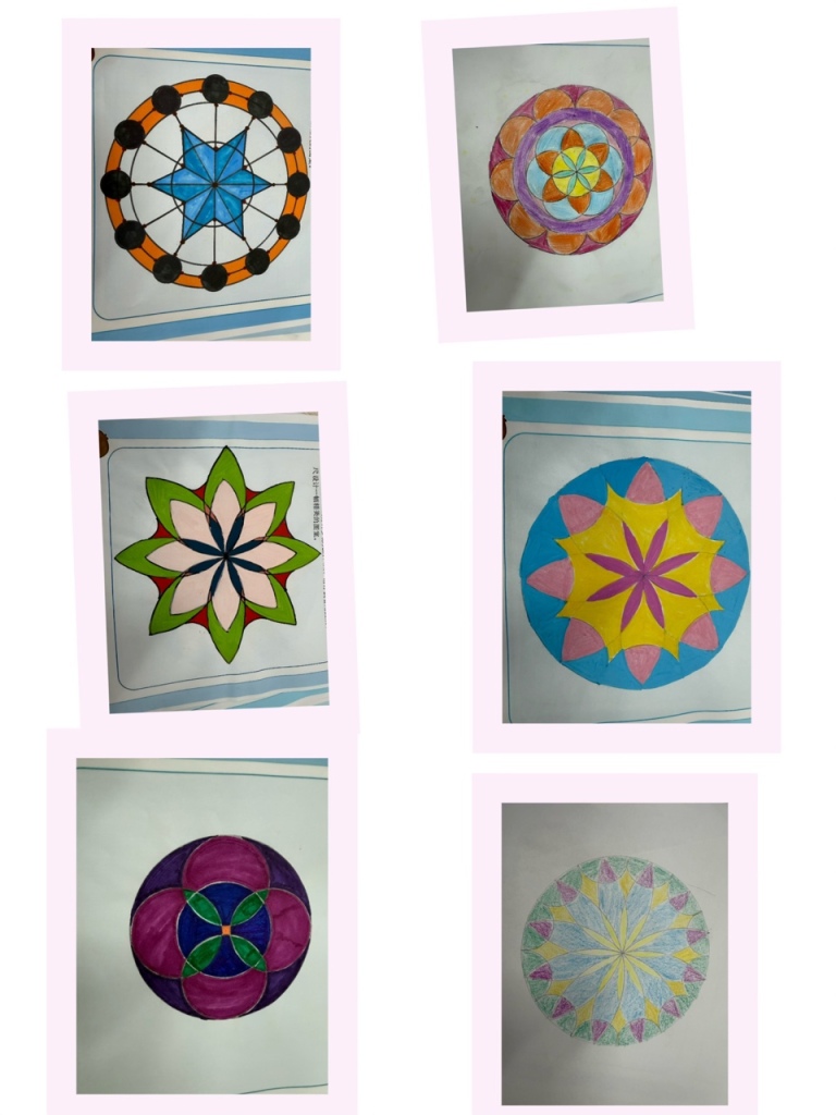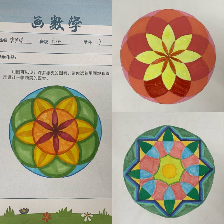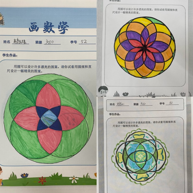 课堂上,师生共同梳理圆的基本性质,探讨几何变换的多种可能;课后,学生们化身创意设计师,或用圆规精准勾勒,或用色彩巧妙点缀,有的创作出古朴雅致的窗花纹样,有的设计出充满科技感的几何图案,还有的将校园景物融入圆的构图,每一幅作品都凝聚着思维的火花与审美的巧思,更见证了从“不敢尝试”到“大胆创新”的蜕变。