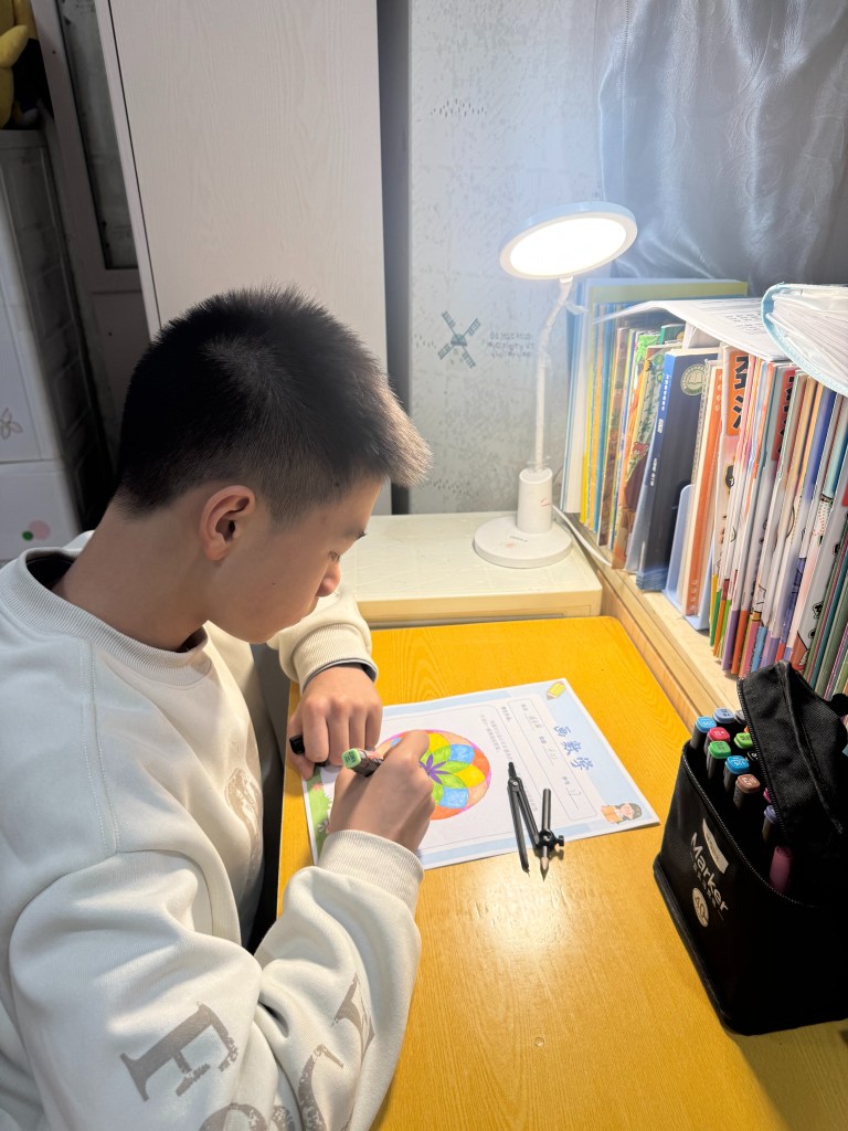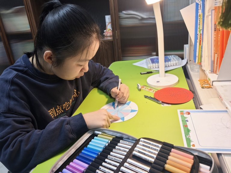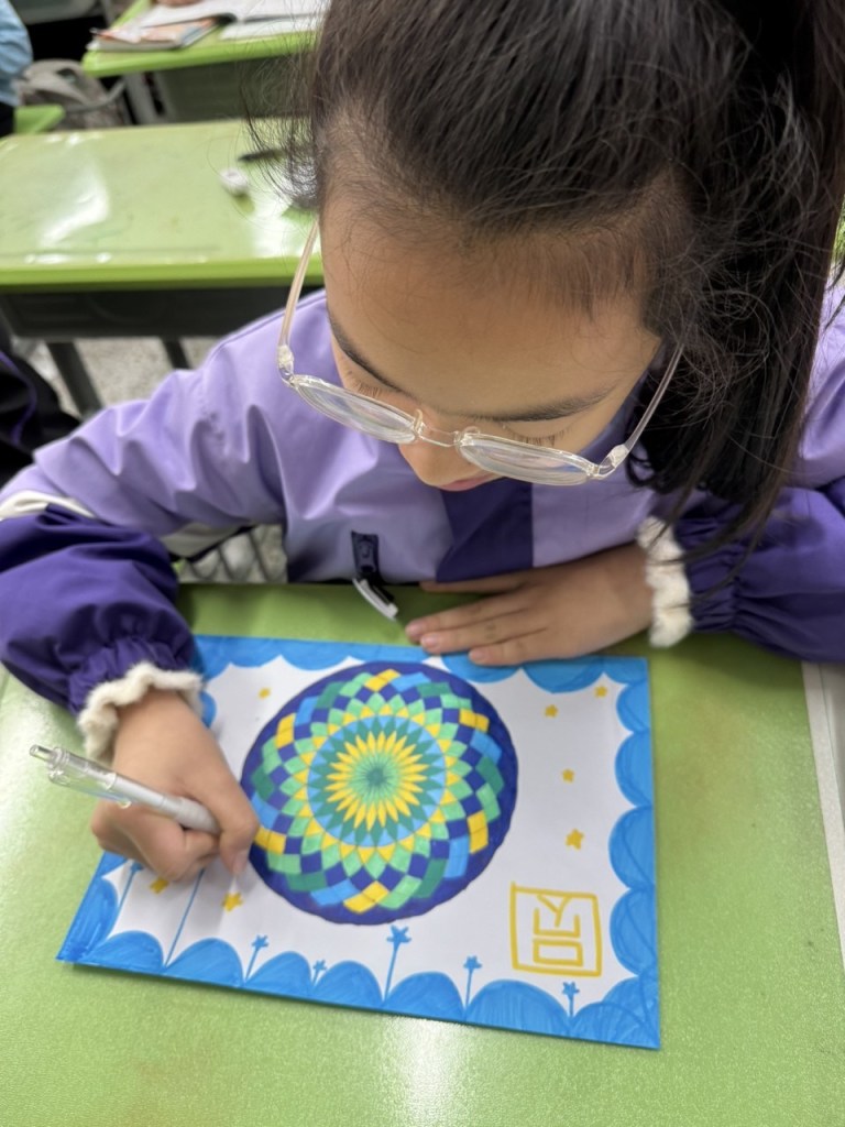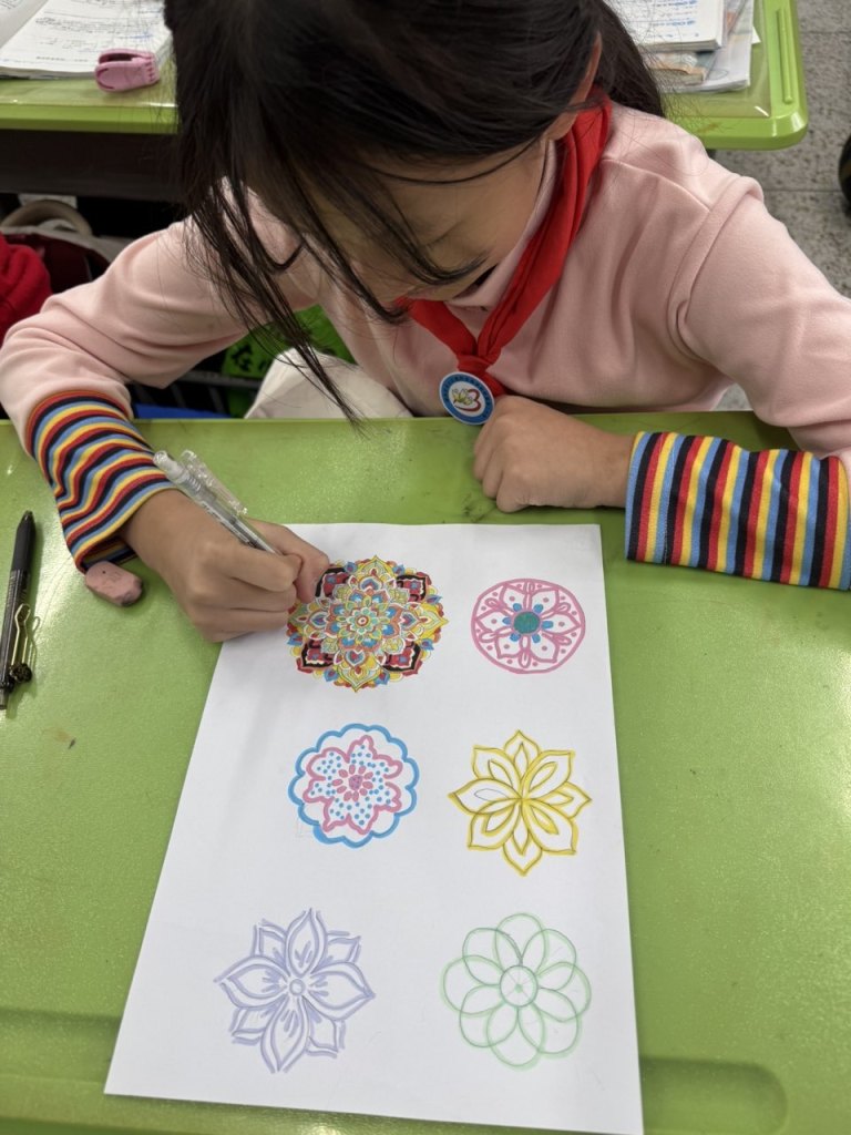 活动伊始,教师紧扣成长型思维培养目标,着重引导学生树立“能力可塑、进步可期”的学习信念。面对“如何让圆形变出花样”的难题,老师鼓励大家摒弃“画不好就放弃”的固定思维,把每一次线条的偏差、图案的调整都视作探索的阶梯;从最初只会画单一圆形,到尝试通过平移、旋转、叠加创造组合图形,再到结合色彩与创意赋予图案独特寓意,学生们在一次次试错与改进中,切实体会到“挑战即成长”的真谛。