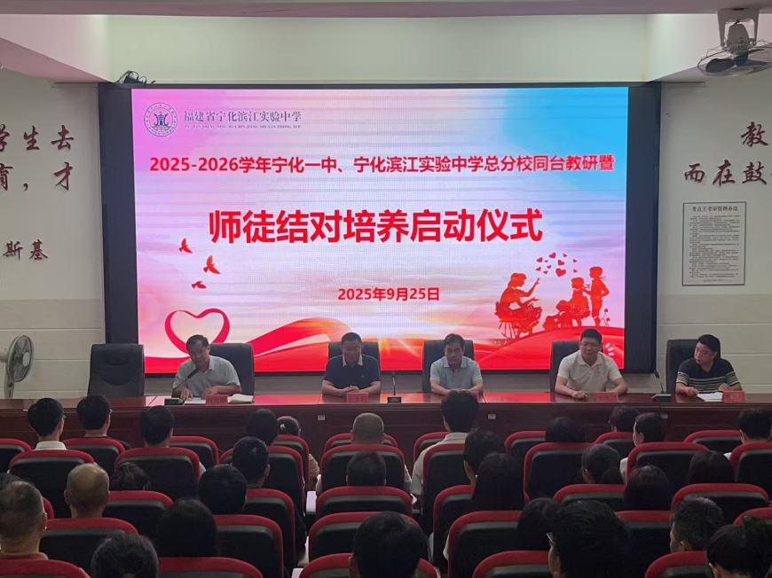 9月25日,宁化一中与滨江实验中学联合举办第六届“青蓝工程”启动暨师徒结对仪式。参加师徒结对仪式的嘉宾有宁化一中党总支书记吴太明,宁化滨江实验中学党总支书记陈建、校长刘志明,一中总校各学科名师及我校部分教师。