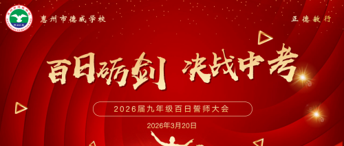 百日砺剑,决战中考—惠州市德威学校举行2026届中考百日誓师大会 百日磨利剑,今朝试锋芒;少年有志,踏浪前行。2026年3月20日下午,惠州市德威学校报告厅内旌旗猎猎、热血沸腾,隆重的举办了以“百日砺剑,决战中考”为主题的2026届九年级百日誓师大会。学校党总支刘文清书记、黄百艺副校长、刘琨副校长,德育处谢娟主任、九年级全体师生及部分家长代表齐聚现场,共赴这场青春的誓师之约,大会由德育处主任...