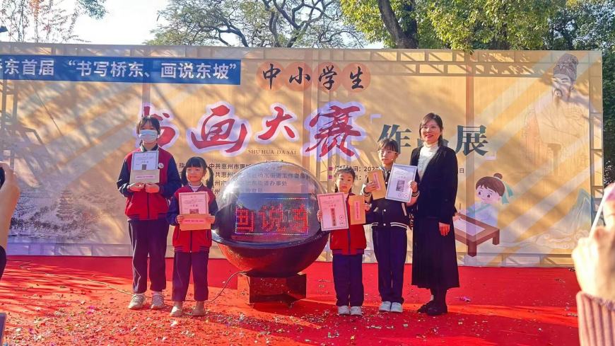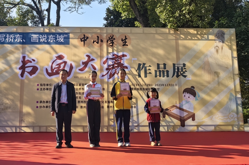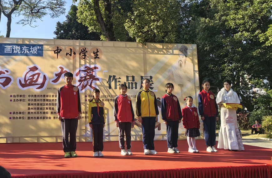 为了让学生深入了解和传承桥东文化、东坡文化,惠城区教育局和桥东街道办事处联合举办了首届“书写桥东,画说东坡”学生书画大赛作品展。惠州市德威学校共35幅学生作品入展、获奖。荣获一等奖1名,二等奖2名,三等奖2名,优秀奖5名,学校被评为最佳组织单位。我校八5班利晨熙同学作为获奖学生代表上台发言。