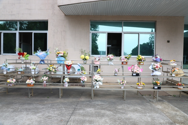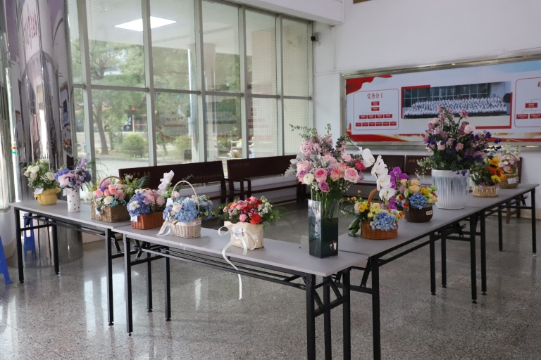 同学们的作品呈现出一派青春活泼的视觉审美,恰好反映了学生积极向上的阳光心态。90分钟的插花活动,同学们一共完成了105组花艺设计作品,这些作品被摆放在行政楼大堂,展示现场群芳竞艳,香远益清,为书香校园又增添了一笔秀色。
