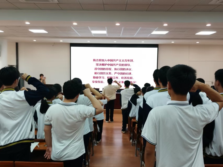 入团宣誓环节,新团员们在领誓人郭梓杨老师的带领下,举起右手,庄严宣誓。“我志愿加入中国共产主义青年团,坚决拥护中国共产党的领导……”誓言铿锵有力,回荡在会场上空,彰显着新团员们为共产主义事业而奋斗的决心。