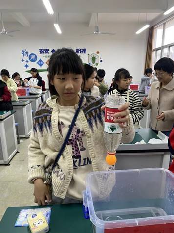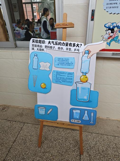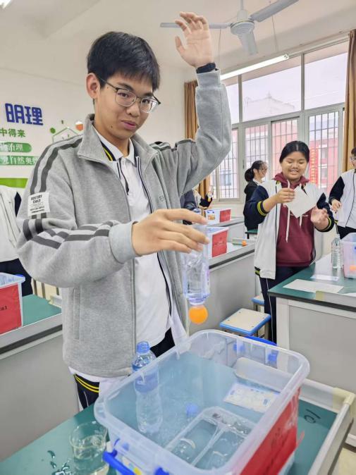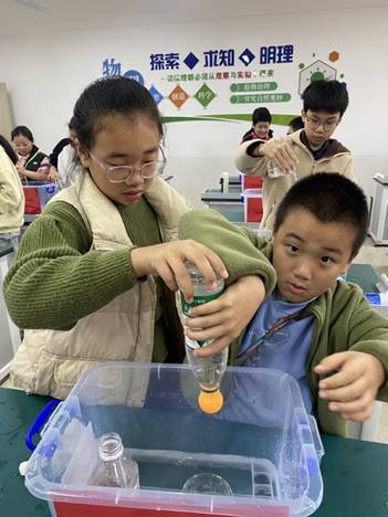 直观感受看不见摸不着的大气压。装满水的矿泉水瓶上演了“吸”乒乓球、纸巾封水不渗漏的神奇操作,即便纸巾被戳出小口,水也未如预期般倾泻。实验以直观趣味的形式,解开大气压的奥秘,让学生真切感知到大气压强的存在,明白其能抵消重力、实现“反向托举”的科学道理。在动手实践中理解大气压与生活的关联,像吸管喝水、吸盘挂钩的原理都能在此找到答案,实现知识与生活的无缝衔接。
