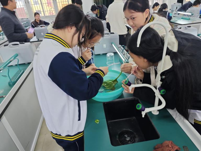 微观探索植物的 “生命门户”。七年级学生将借助显微镜,观察叶片表皮上的气孔结构,亲眼看到这些微小的 “门户” 如何开合。将菠菜叶浸于水中,向叶柄吹气,气泡会从气孔逸出以定位位置;通过亲手制作临时装片、调试显微镜,学生既能提升实验操作技能,又能揭开植物 “呼吸” 的神秘面纱。