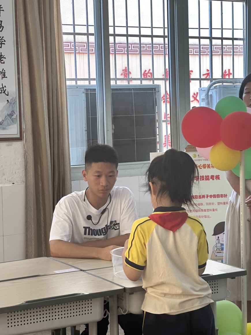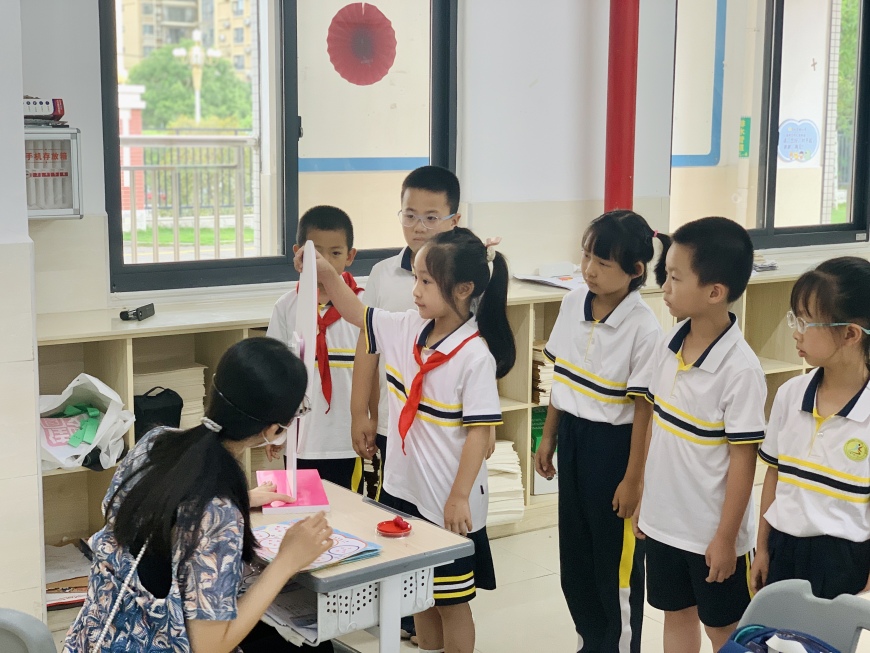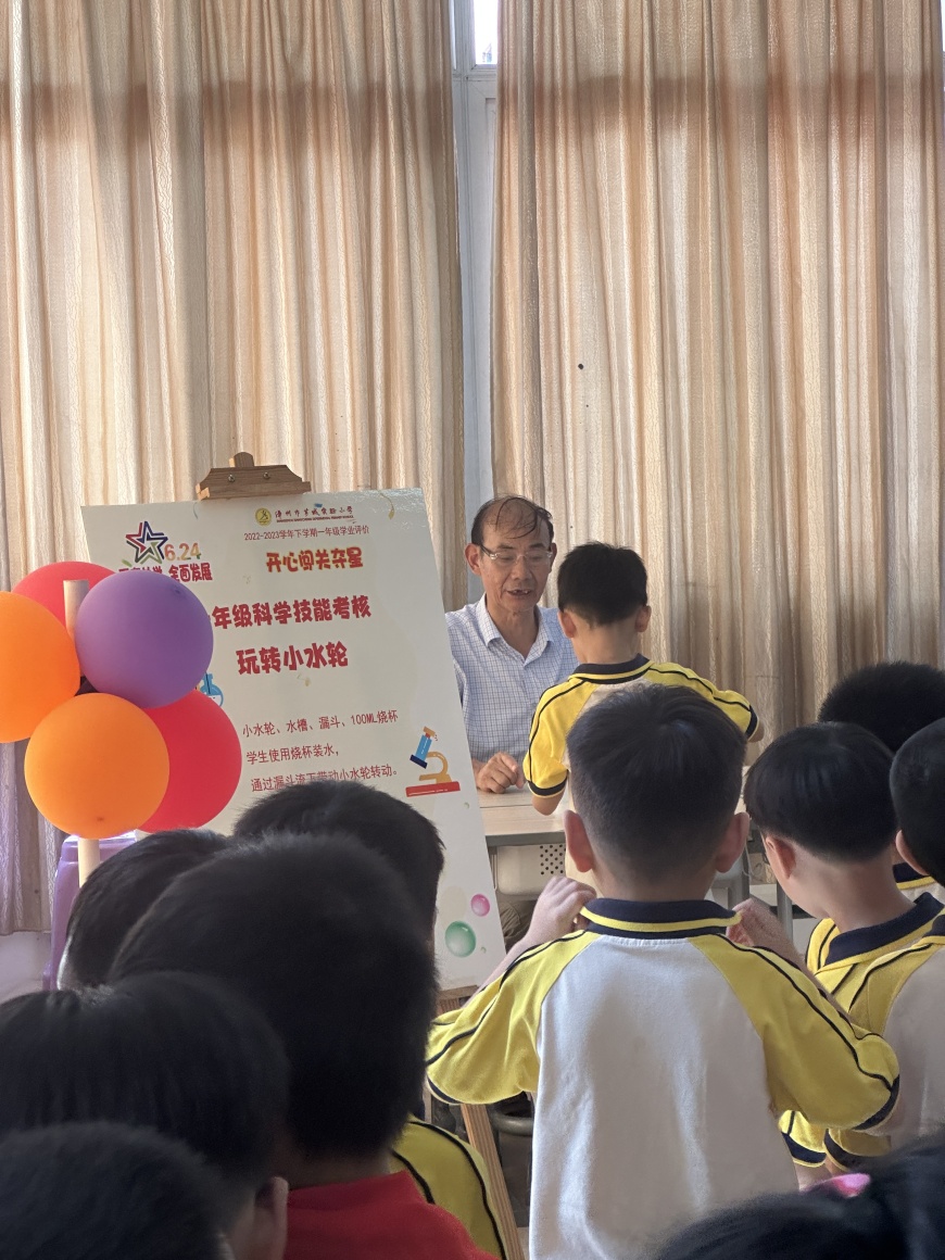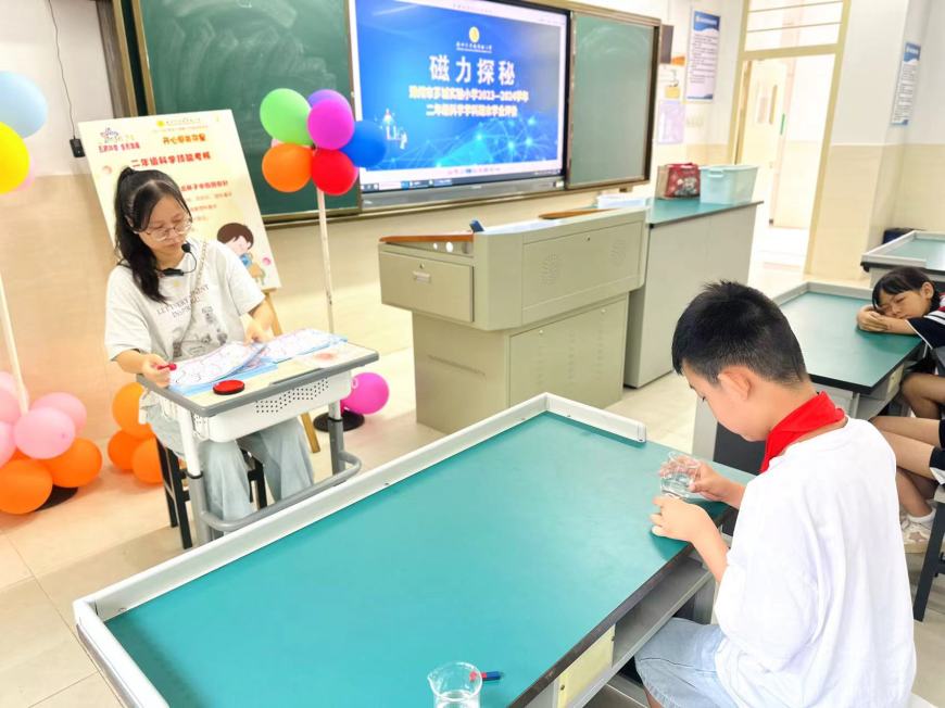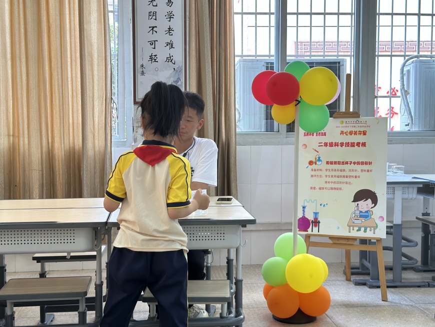 看,桌子上摆满了道具:磁铁、回形针、小水轮、漏斗……“科学世界”测评巧妙地将科学要考察的知识点融合到丰富多彩的磁铁、小水轮的世界里。同学们在“玩”中有“思”,发现了科学的秘密。