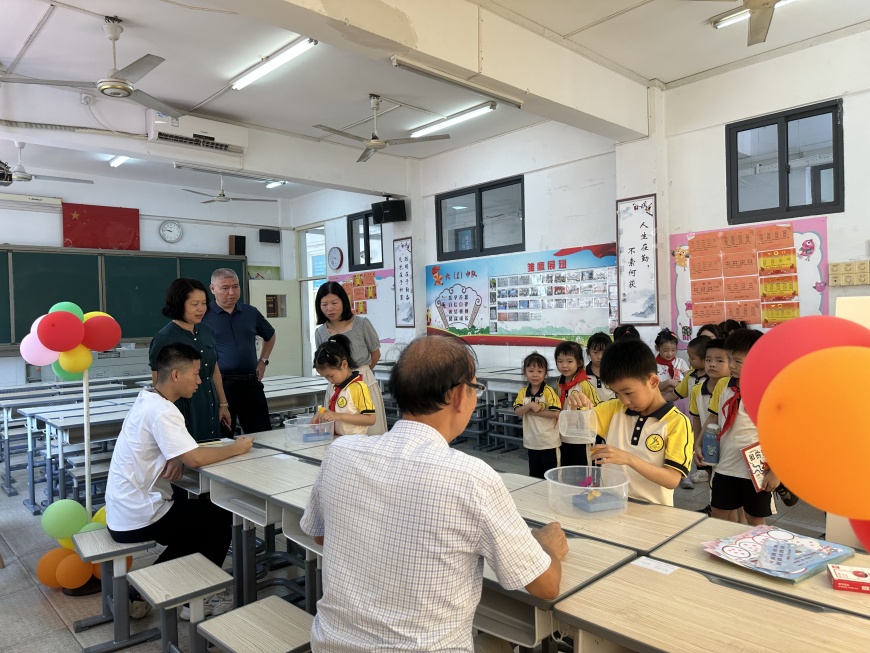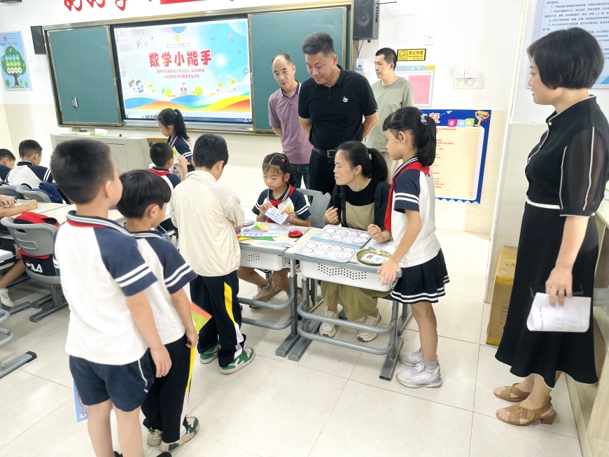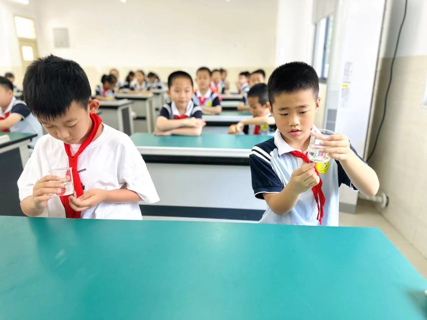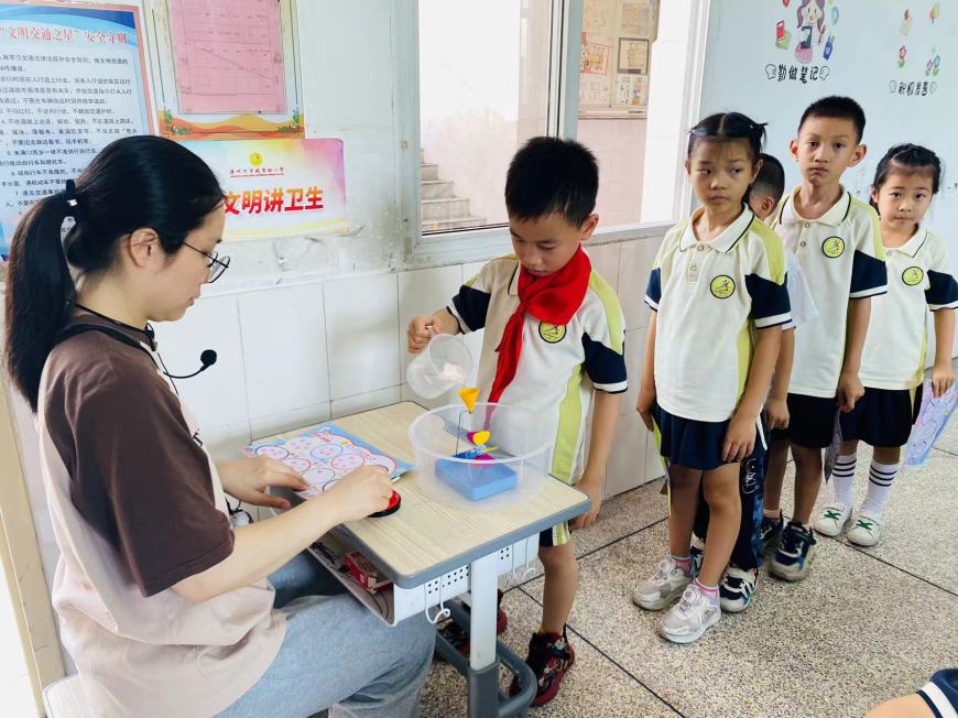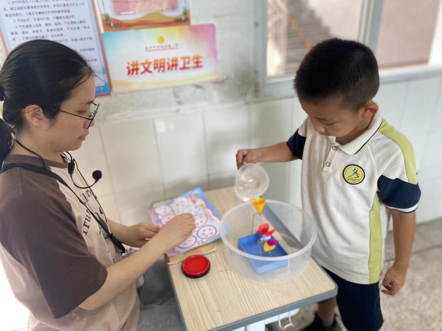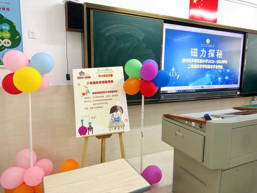 看,桌子上摆满了道具:磁铁、回形针、小水轮、漏斗……“科学世界”测评巧妙地将科学要考察的知识点融合到丰富多彩的磁铁、小水轮的世界里。同学们在“玩”中有“思”,发现了科学的秘密。