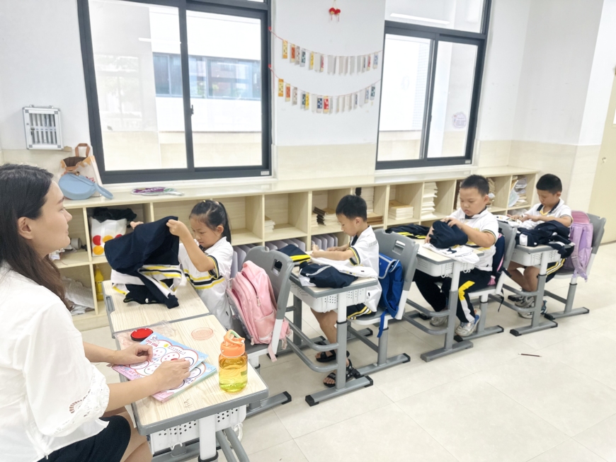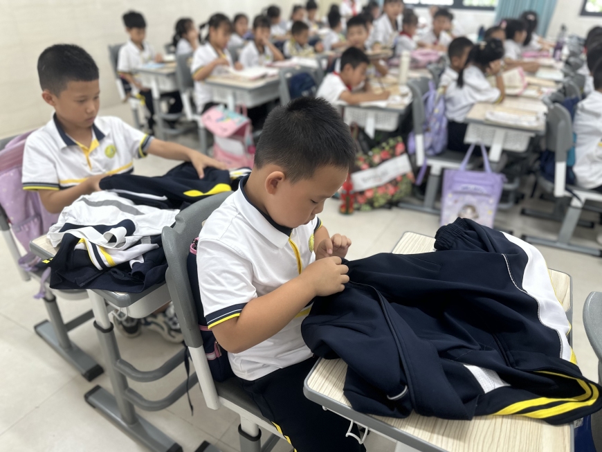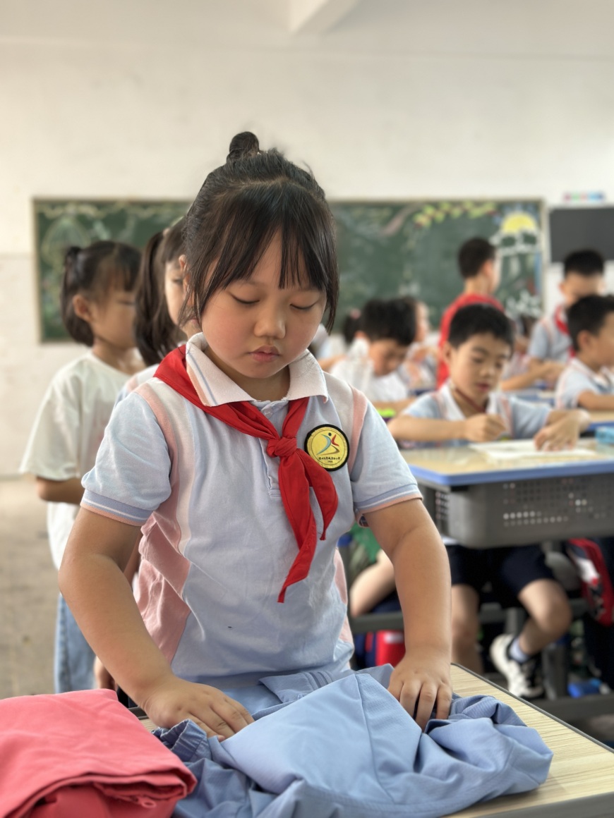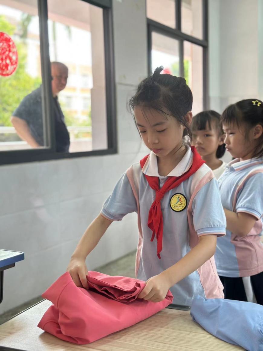 一二年级的孩子们通过“整理衣物”“整理教室”两个项目的劳动技能大比拼,展现了小朋友们优秀的动手能力。一双双巧手将一件件衣服叠放漂亮,一张张桌子摆放整齐,一个个小星星奖章是对他们劳动技能的肯定。