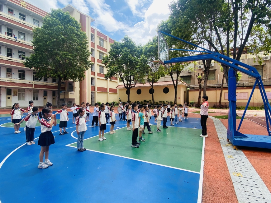 “立正!稍息!向右(左)看--齐!向左(右)转,向后转……”听,操场上响起了一阵阵整齐的口令声。体育学科闯关如火如荼地开展着,考察学生的协调性和敏捷性。同学们在比中玩,在玩中成长!