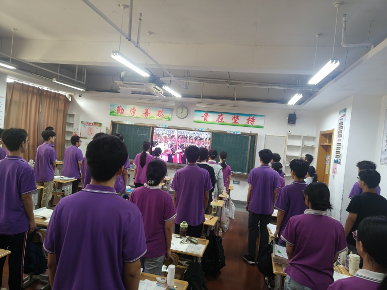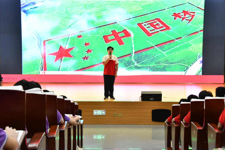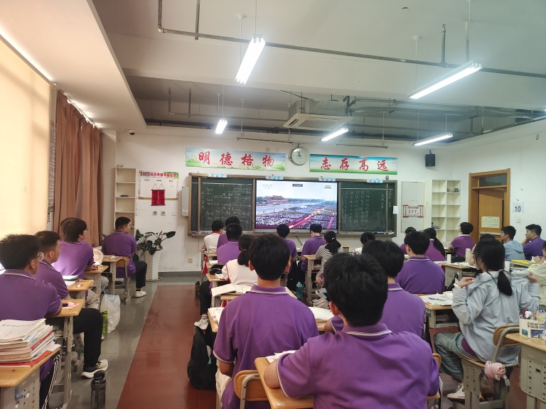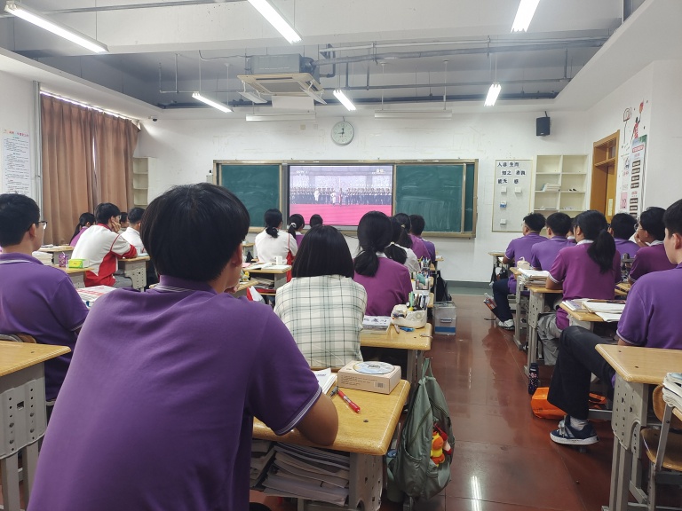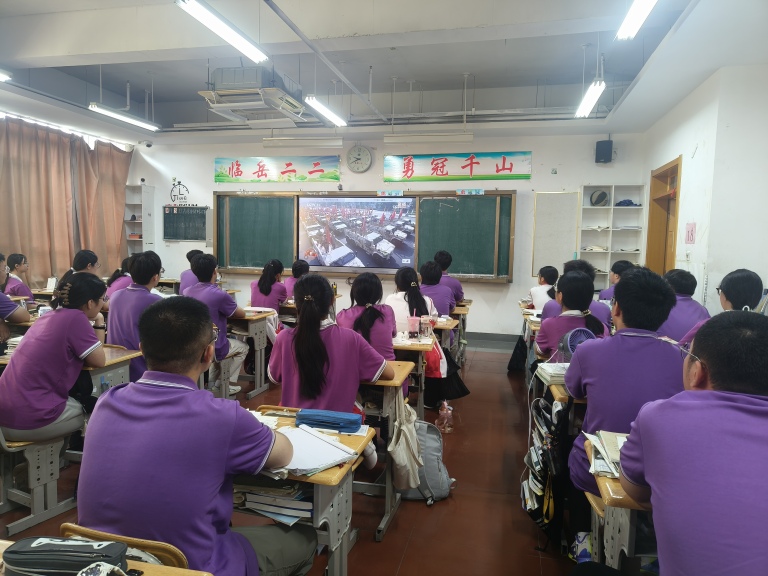 启智剧场内的观看活动由高一24班王艺博和高一26班李思琪主持。正式观看前,高二23班的张柏敖同学以“重回东方主战场”为题,回顾了14年伟大抗日战争。全体学生观看了《人民日报新媒体》发布的短片。