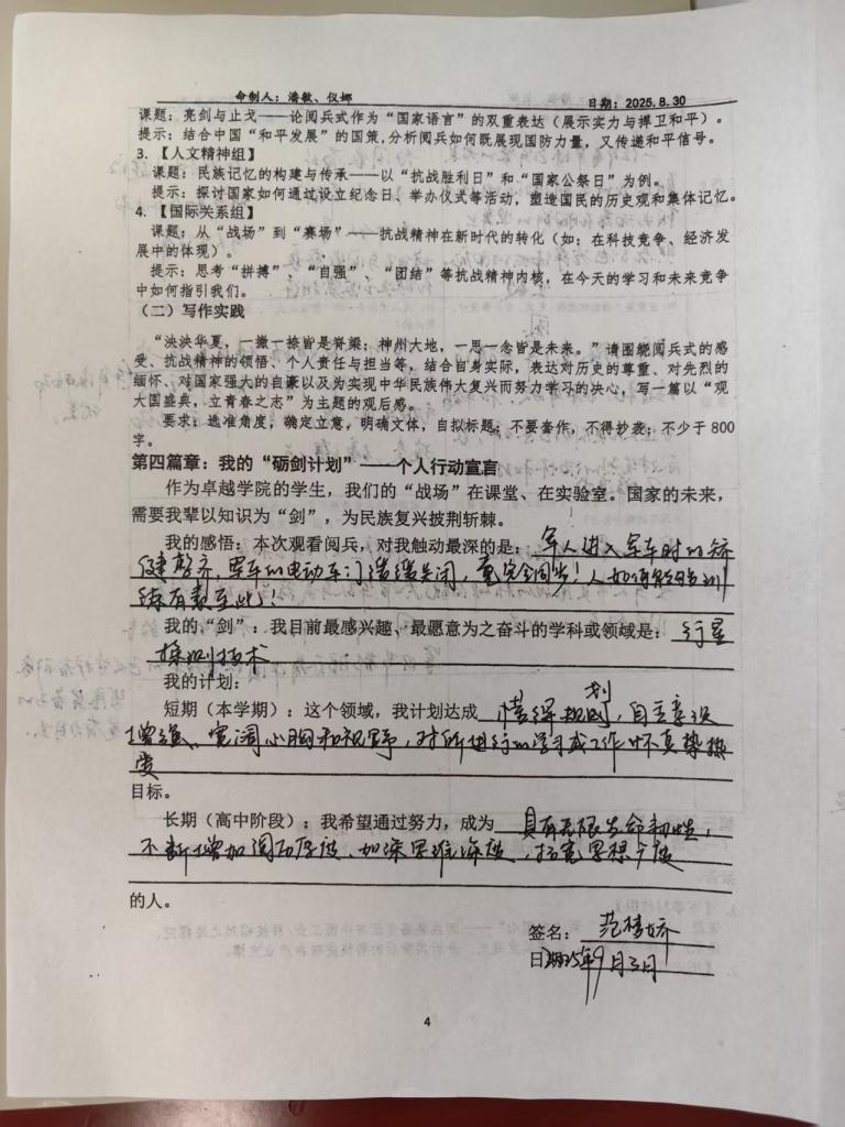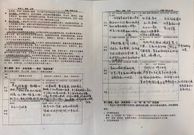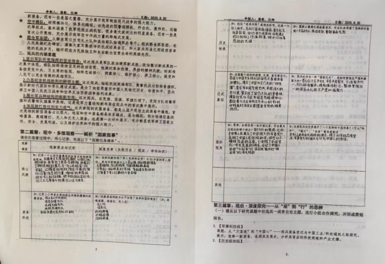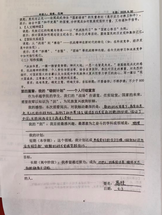 根据观察内容,学校组织学生成立军事科技组,探究课题:从“万国造”到“中国心”——阅兵装备变迁与中国工业/科技崛起之路。成立历史政治组,探究课题:亮剑与止戈——论阅兵式作为“国家语言”的双重表达。成立人文精神组,探究课题:民族记忆的构建与传承——以“抗战胜利日”和“国家公祭日”为例。成立国际关系组,探究课题:从“战场”到“赛场”——抗战精神在新时代的转化。