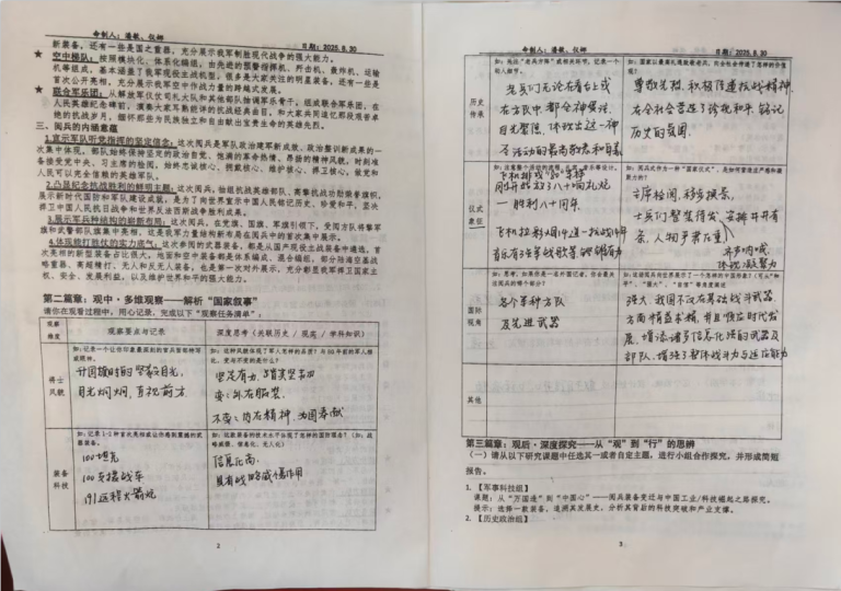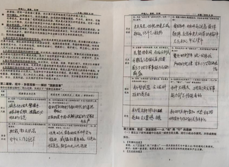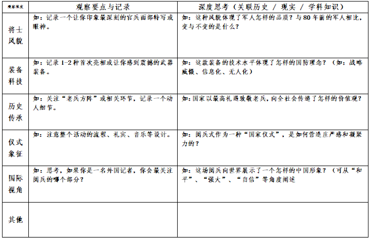 为提高同学们观看的实效性,学校印发了“观察任务清单”,从装备科技、历史传承等维度,引导学生观察大阅兵,思考大阅兵。