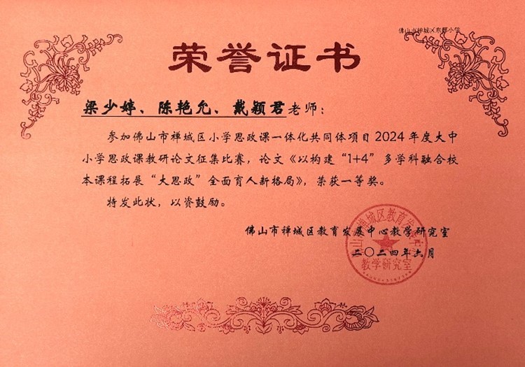 梁少婷副校长、陈艳允校长、戴颖君老师参加禅城区小学思政一体化共同体项目2024年度大中小学思政课教研论文征集比赛,论文荣获一等奖。