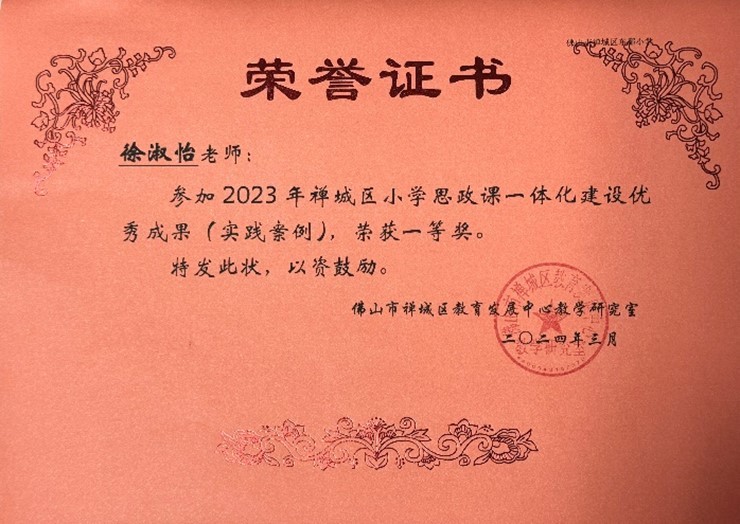 徐淑怡主任参加禅城区小学思政课一体化建设优秀成果(实践案例),荣获一等奖。