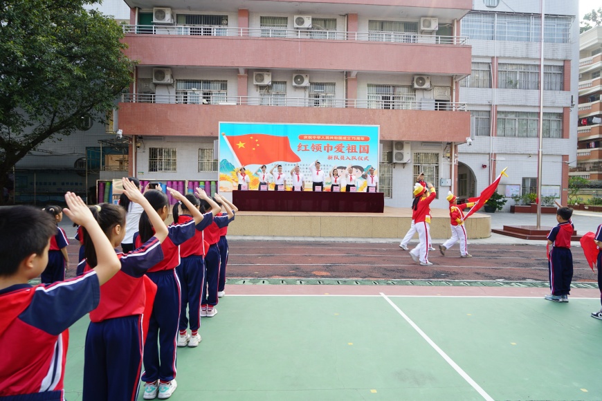 在中国少年先锋队建队75周年之际,肇庆市百花园小学大队部组织开展了“红领巾爱祖国”为主题的庆祝中国少年先锋队建队75周年主题队日活动暨新队员入队仪式。莅临本次仪式的人员有团肇庆市端州区委书记张帅,副书记黄晓宇,团务部负责人周斐,端州区教育局团委副书记李敏华,学校党支部书记、校长、少工委主任梁细汉,学校支部副书记谭少霞,学校少工委常务副主任、副校长金越玲,学校工会主席、副校长欧汉华,学校团支部书记林咏恩,大队辅导员黄琳。