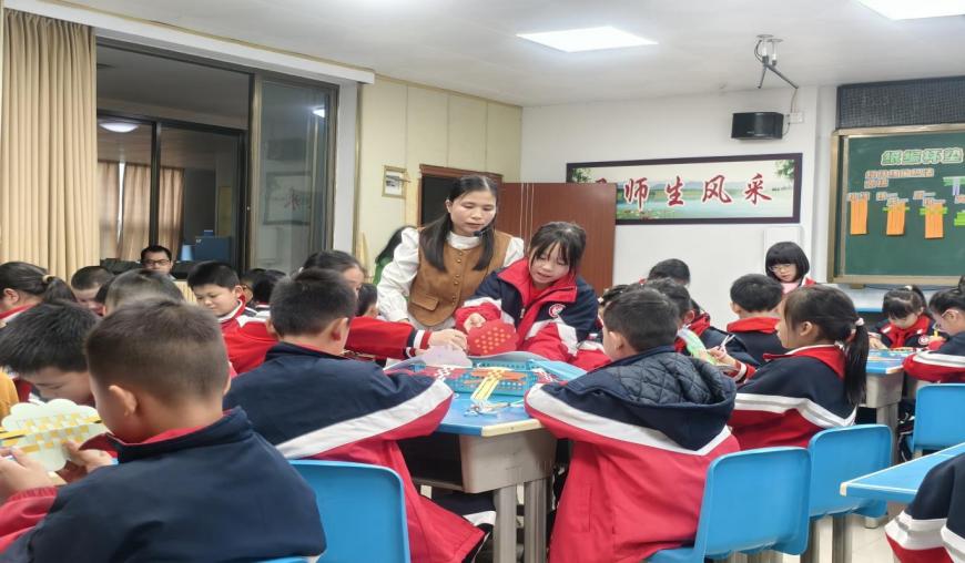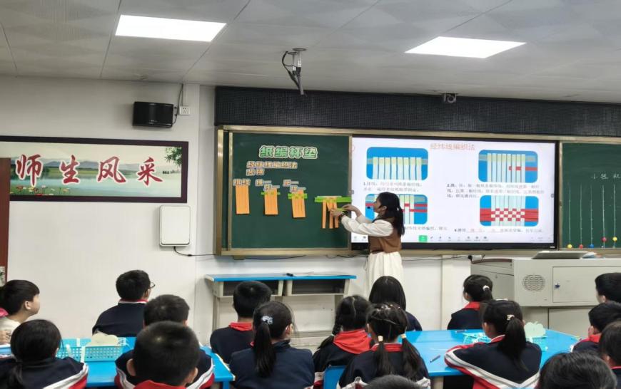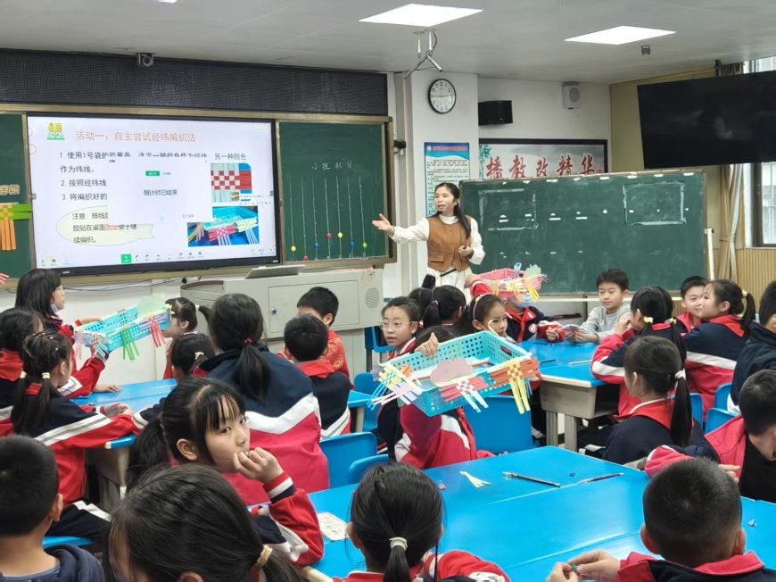 课堂最后,郭老师展示了纸编小篮子、书签等延伸作品,引导学生拓展思维,探索经纬编织法的更多应用场景。她鼓励学生课后教家人编织技巧,尝试用家乡竹篾制作环保编织品,让劳动技能走出课堂、融入生活。