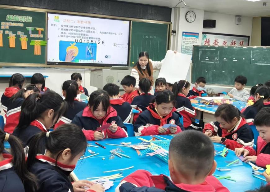 创意创作环节,伴随着轻柔的背景音乐,学生们充分发挥想象力,在掌握基础技法的基础上,尝试"挑二压二"等花纹变化,精心搭配色彩、设计造型。课堂氛围轻松愉悦,孩子们指尖翻飞间,一张张普通的彩色卡纸逐渐变成了精致的杯垫作品。