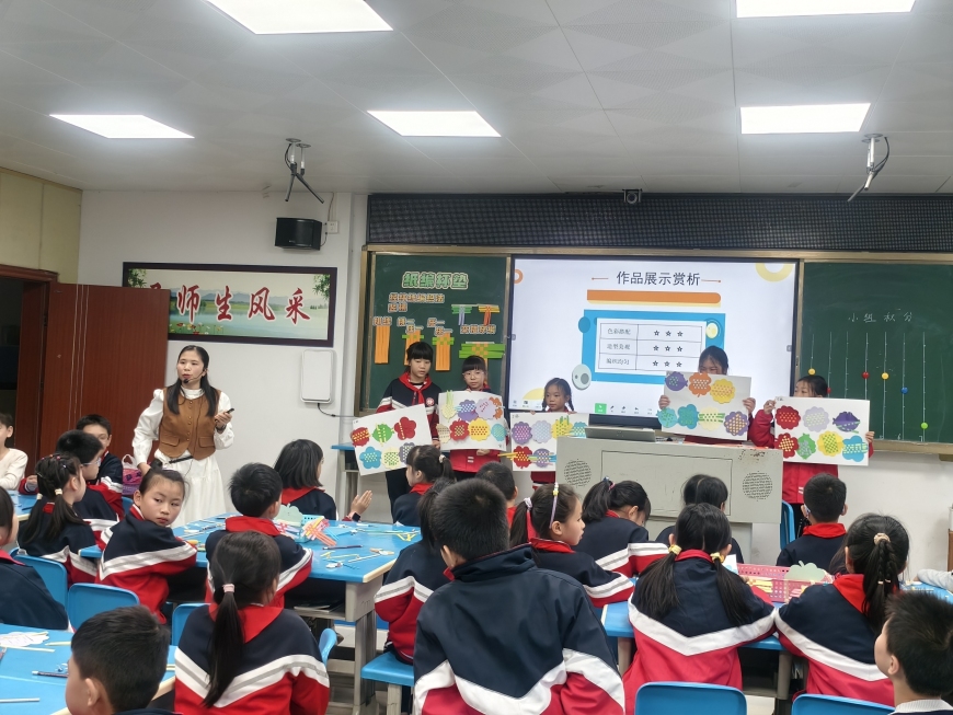作品展示环节,"魔法森林展"正式开启。通过互评、自评、师评相结合的多元评价方式,学生们将作品粘贴展示,互相分享创作思路,真诚点评同伴作品的优点与改进建议,对照标准为自己的学习成果打分。郭老师选取代表性作品进行点评,既肯定了学生的创意与努力,也提出了针对性的改进意见,让每位学生都感受到了劳动带来的成就感。