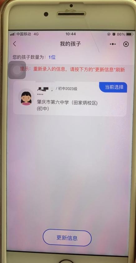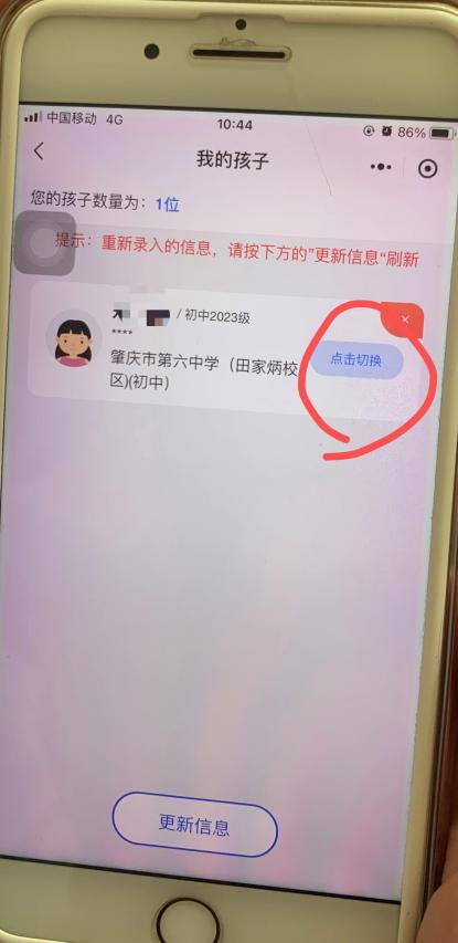 如果操作不成功,请进入端校易首页【切换孩子】,点击下方更新信息,重新授权后,会刷新出学生新学校信息,点击切换即可。