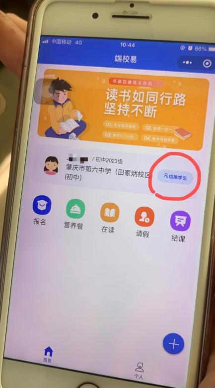 手机微信登录端校易小程序,点击“课后服务”,就会见到孩子的姓名已经关联了我校初中部,点击【点击切换】,就会刷新出学生新学校信息,那就说明已经绑定成功了;