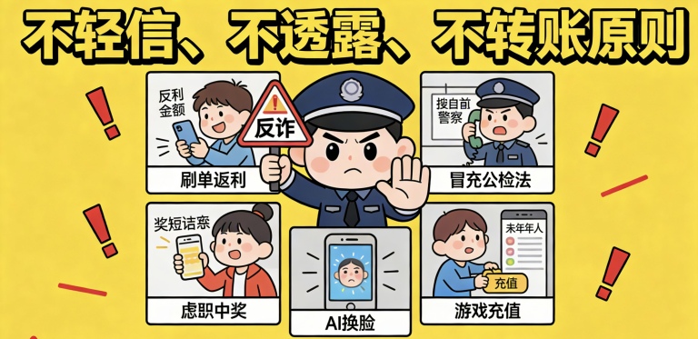 2.警惕 “刷单返利”、“冒充公检法”、“虚假中奖”“游戏充值”“AI 换脸” 等新型诈骗手段。