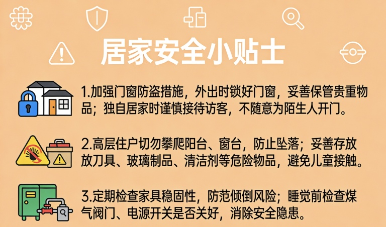 1.加强门窗防盗措施,外出时锁好门窗,妥善保管贵重物品;独自居家时谨慎接待访客,不随意为陌生人开门。
