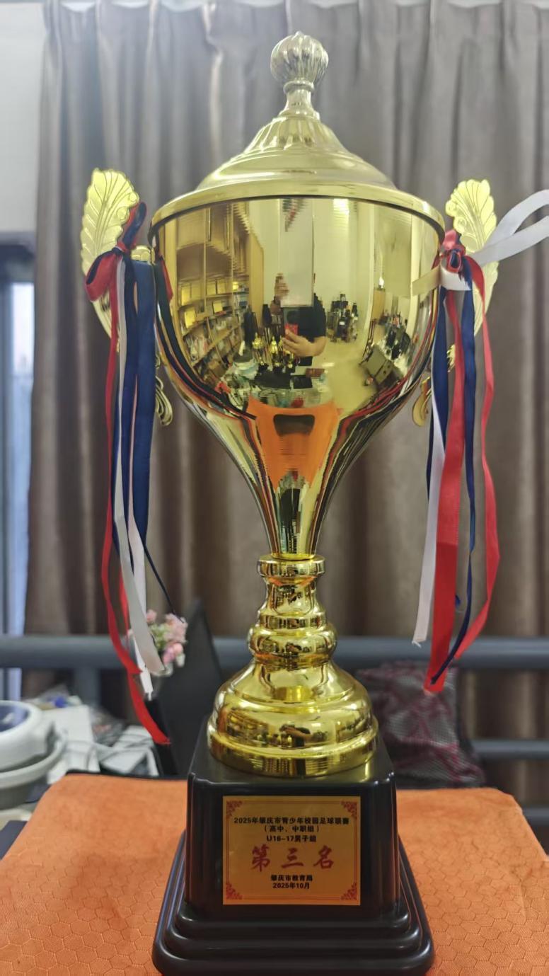 2025年10月25日至28日,由肇庆市教育局主办、端州区教育局与鼎湖区教育局协办的2025年肇庆市青少年校园足球联赛(高中组、中职组)U16—17男子组比赛隆重举行。我校足球队与来自全市各区县的多支劲旅同场竞技,小组赛阶段,队员们凭借灵活的战术布置和顽强的斗志,先后战胜四会中学、肇庆市农业学校、鼎湖区某中学等对手,以小组第一的身份晋级淘汰赛;半决赛中,面对实力强劲的广宁中学,不幸一球落败,队员们虽憾负对手,但全程展现出的永不言弃的体育精神赢得了全场观众的掌声;决赛中,与封开广信中学展开展开激烈角逐,上下半场双方互有攻防,守门员神勇无比,扑出了对方的多次危险射球,全程以0:0的比分拖入点球大战,最终在点球大战中战胜对手,获得了季军。用脚下技艺诠释了对足球运动的热爱与坚守。