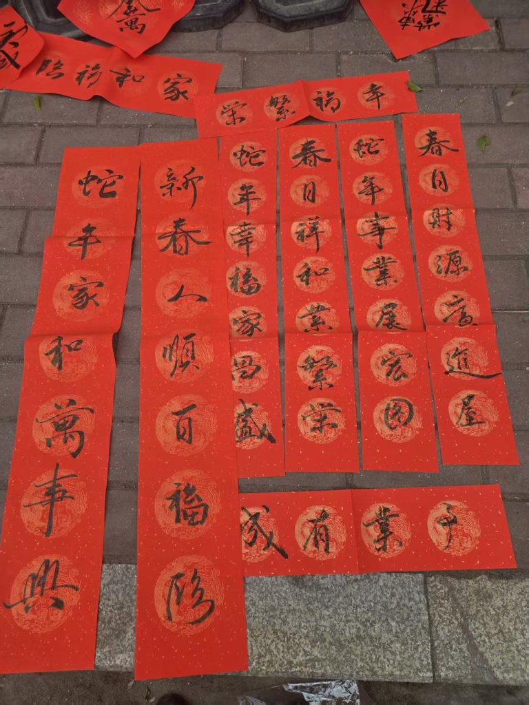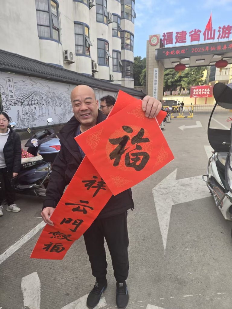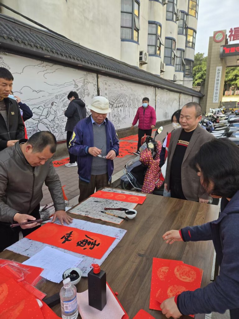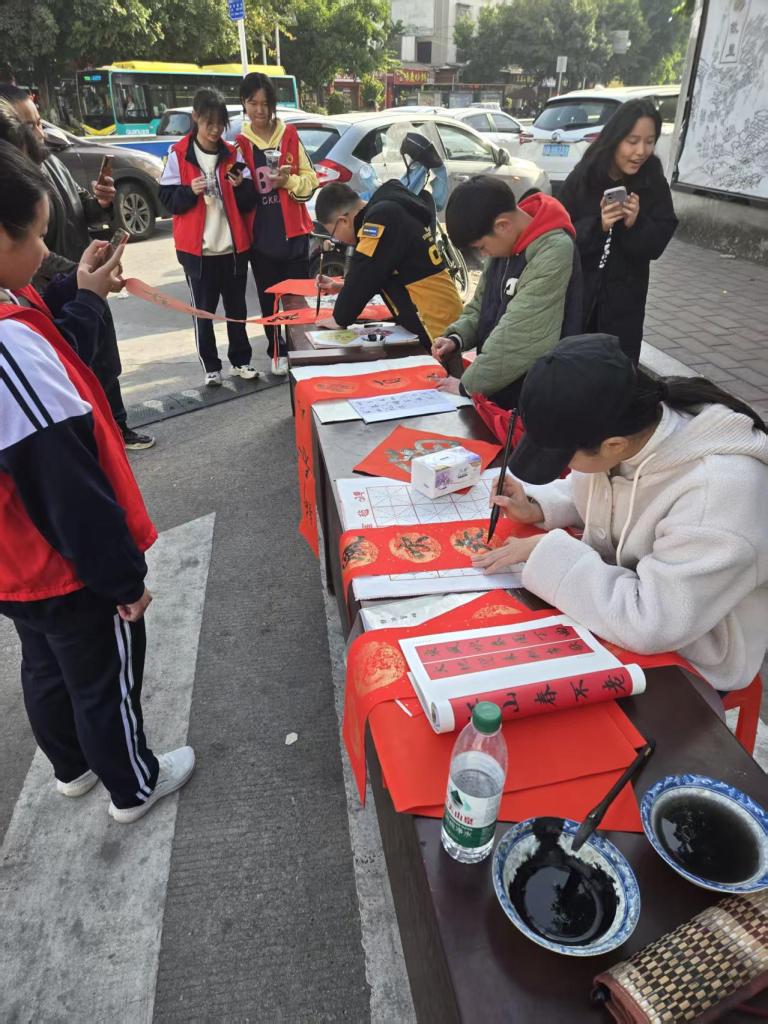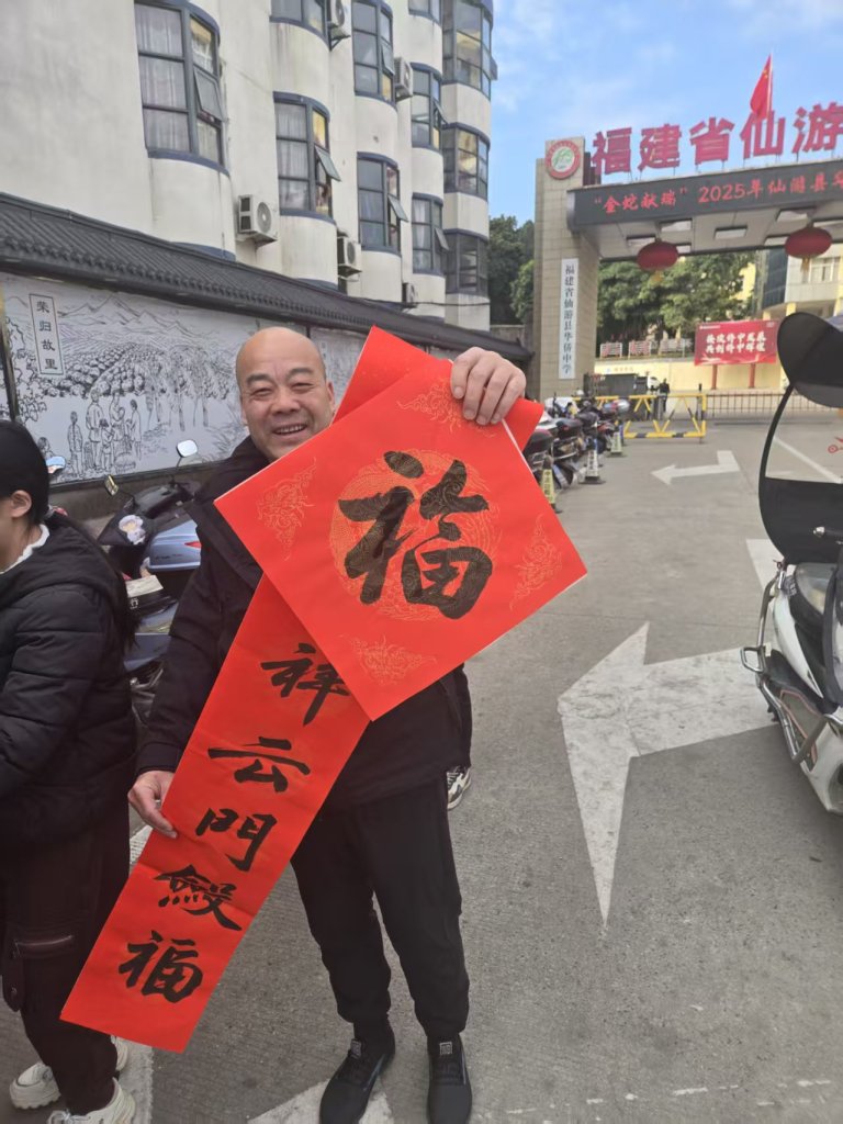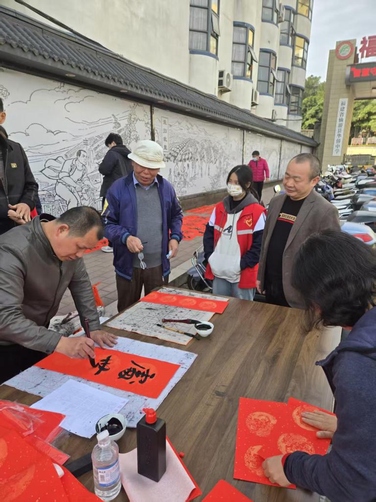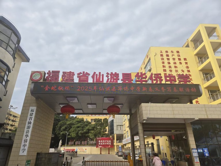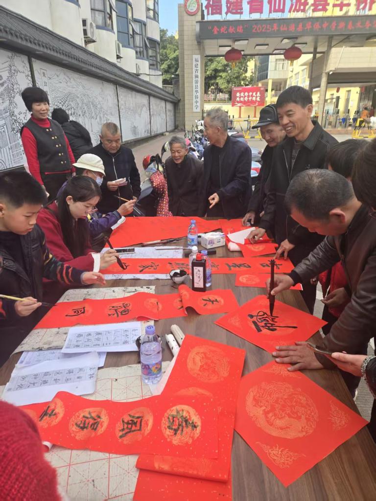 2025年1月25日,一场主题为“金蛇献瑞”的义务写春联活动于春节前在仙游华侨中学校门口热闹举行。应邀来校的县书画名家赵贺民、陈风华、我校书法老师傅正兵、刚刚在今年县教育系统迎春书画展中获奖的傅开宏、刘秀峰老师以及多次在县书法比赛中获奖的郑英凡老师带领着学生们在校门前挥毫泼墨,为赖店镇附近村民们书写新年春联。
