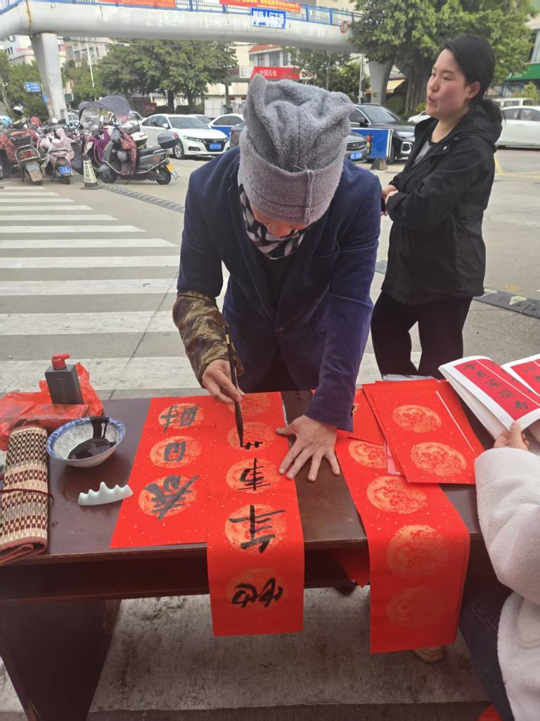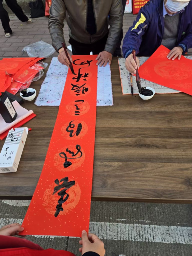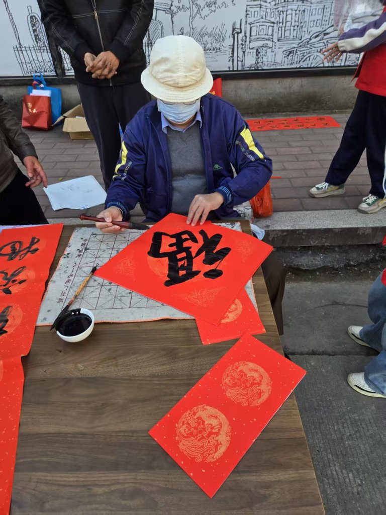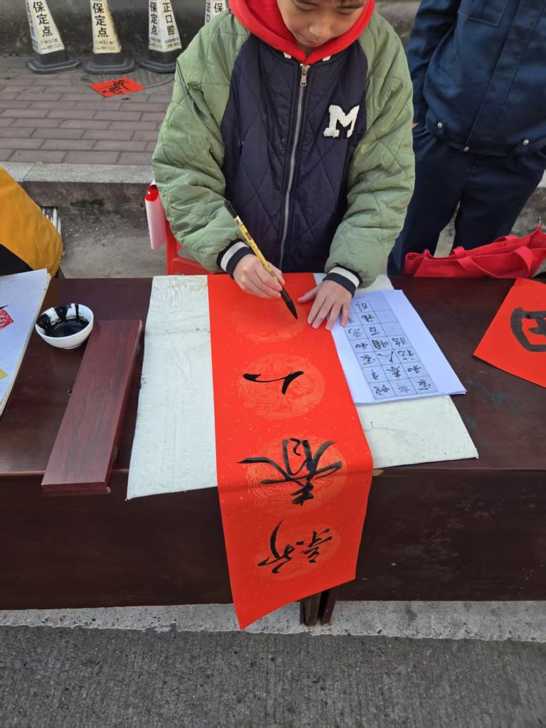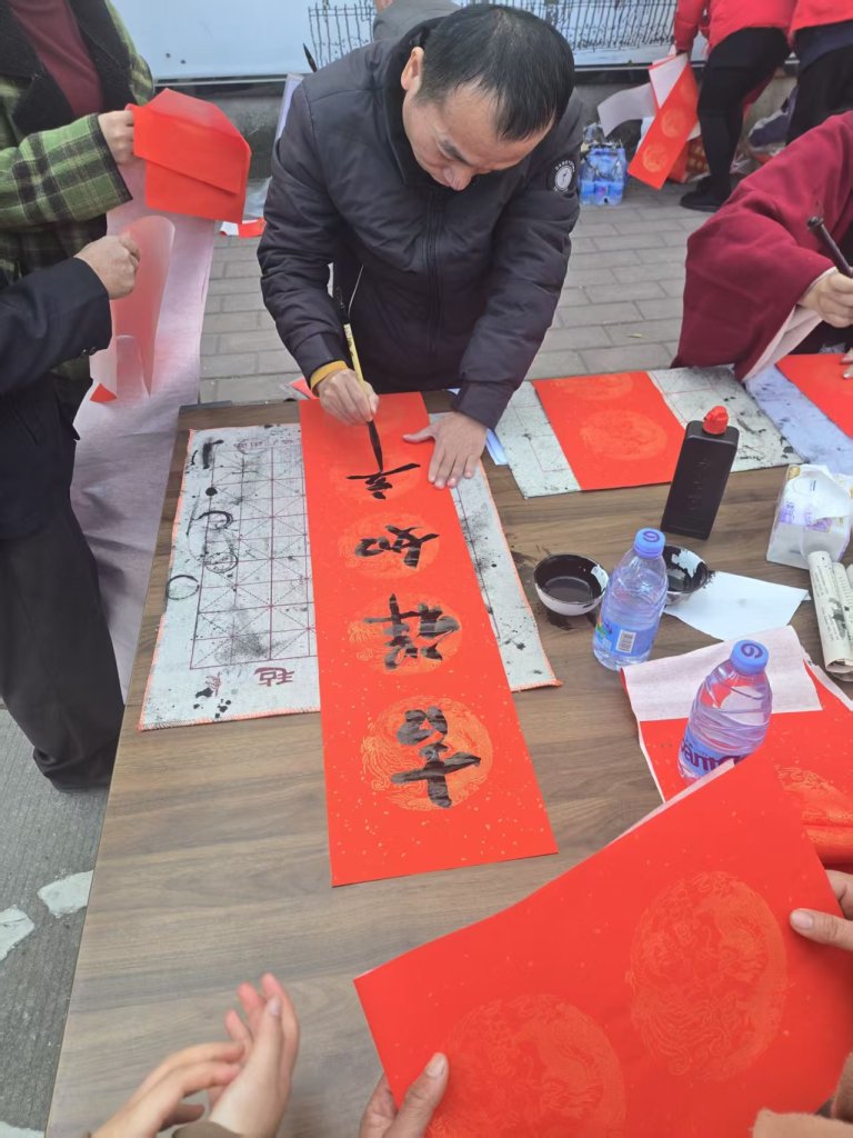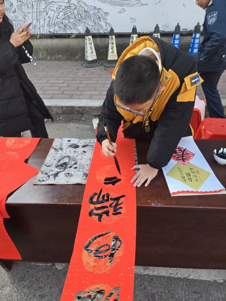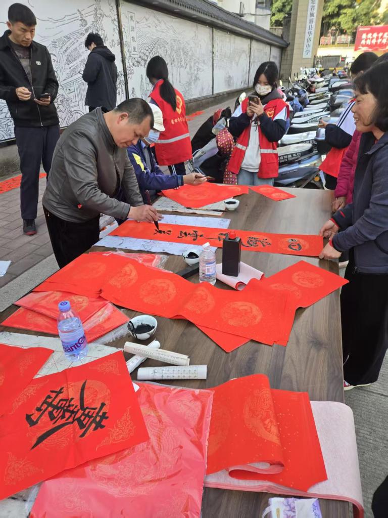 活动现场墨香四溢,一叠叠喜庆的红纸铺展得整整齐齐,师生们凝神聚力,将对新春的深切期盼融入这一副副春联与福字之中。村民们纷纷围在书写台前,细细品味着每一副春联,有的还现场定制春联内容,师生们也是有求必应,尽力满足大家的需求,为周边的居民群众送去了最真挚的节日问候。活动现场气氛火热,周边居民们闻讯赶来,挑选着中意的春联。此次活动共送出春联上百幅,不仅为居民们送去了物质上的新春装饰,更传递了精神上的温暖与关怀。