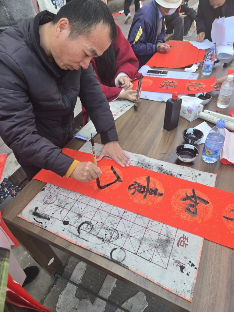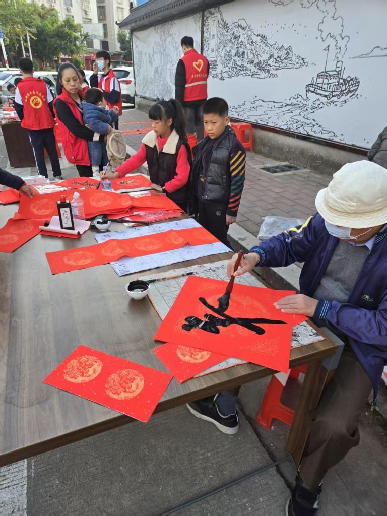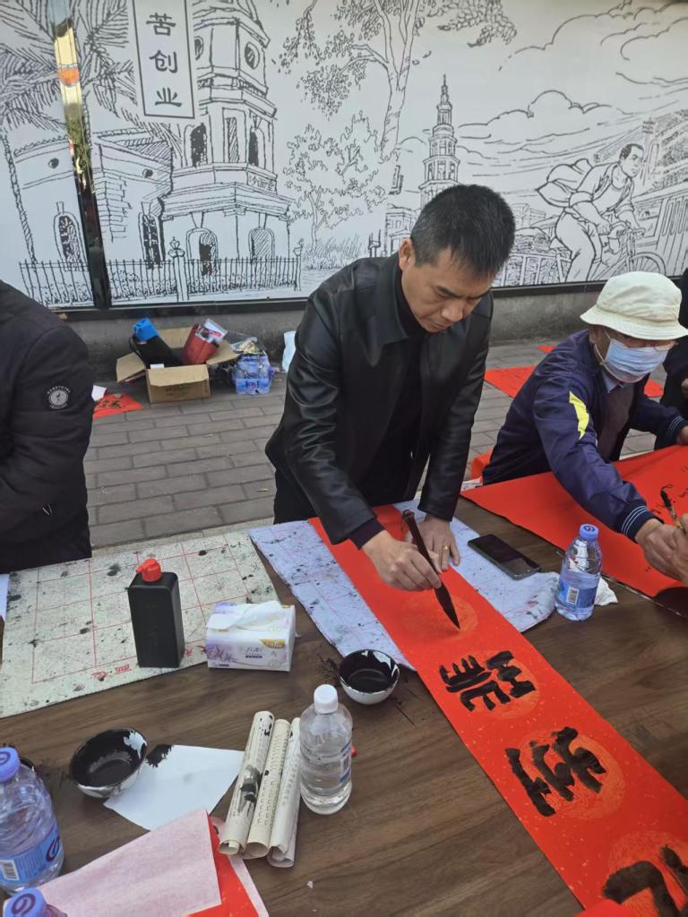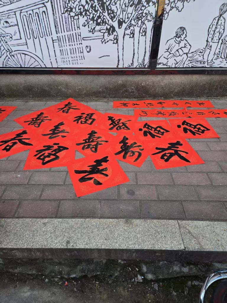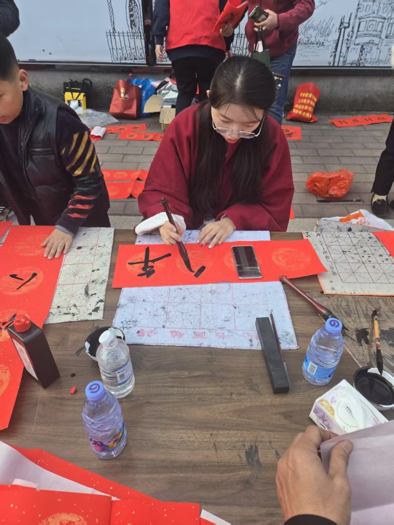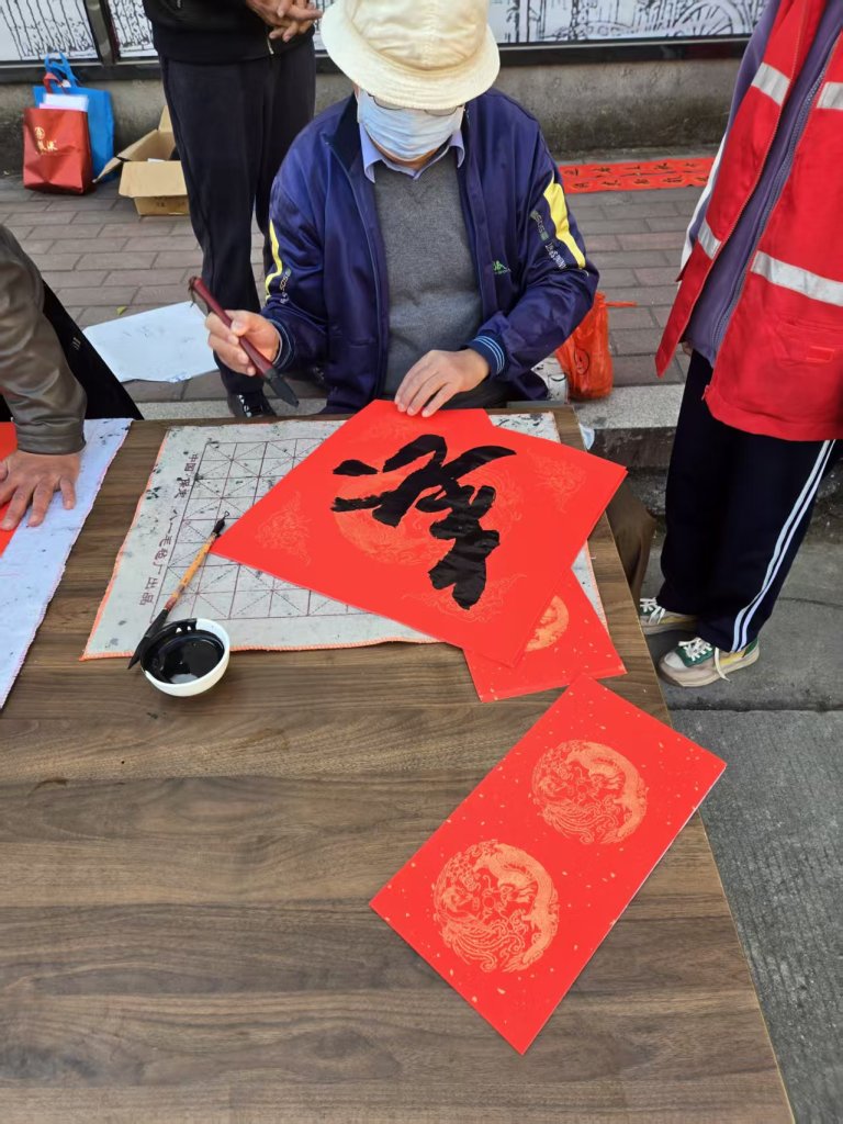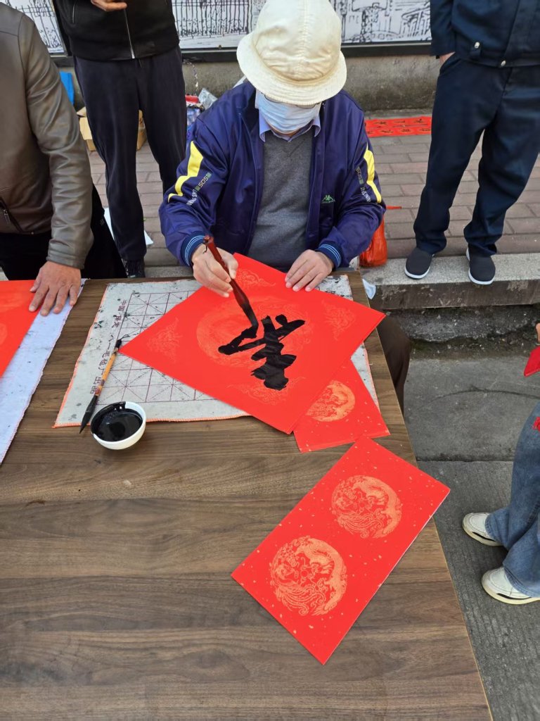活动现场墨香四溢,一叠叠喜庆的红纸铺展得整整齐齐,师生们凝神聚力,将对新春的深切期盼融入这一副副春联与福字之中。村民们纷纷围在书写台前,细细品味着每一副春联,有的还现场定制春联内容,师生们也是有求必应,尽力满足大家的需求,为周边的居民群众送去了最真挚的节日问候。活动现场气氛火热,周边居民们闻讯赶来,挑选着中意的春联。此次活动共送出春联上百幅,不仅为居民们送去了物质上的新春装饰,更传递了精神上的温暖与关怀。
