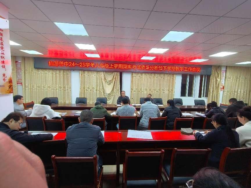 2月25日晚,仙游侨中八年级全体教师齐聚一堂,召开2023-2024学年上学期期末质量分析会暨下学期教学工作会议。总务处副主任李丽泉、八年级段长林美荣及全体八年级教师共同参会,会议由八年级段长林美荣主持。会议聚焦教学质量提升、班级管理优化及中考备考规划,为新学期教育教学工作擘画蓝图。