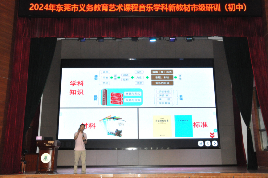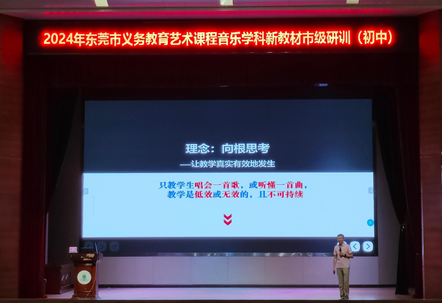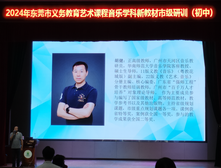 此次培训由东莞市教育局教研室初中音乐教研员李冠老师主持,由广州市天河区音乐教研员、华南师范大学音乐学院客座教授胡健进行专题培训。