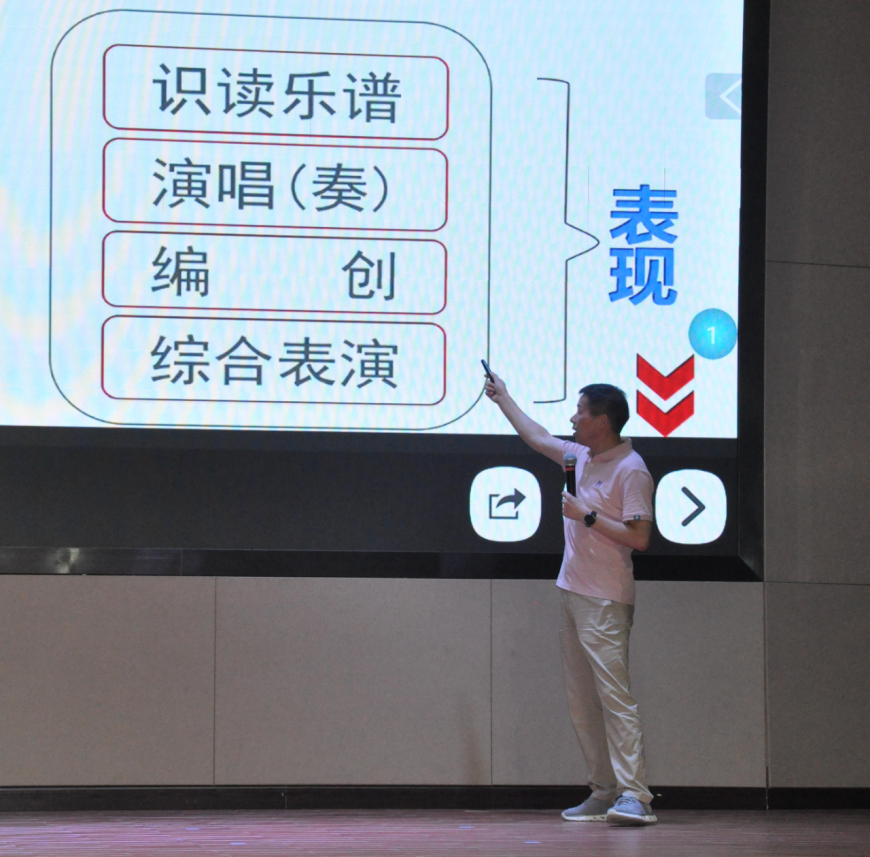 最后,胡老师通过带领教师们演唱歌曲《歌唱祖国》,让大家明白了根据乐谱准确演唱的重要性。他坚信,乐谱乃工具,应该要让学生拥有运用工具解决问题的能力,此乃核心素养之所在。教师如果只教学生演唱歌词而不习唱乐谱,则如无本之木,不可持续。