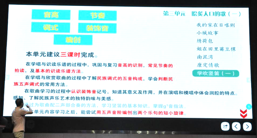 首先,胡老师对单元课时及单元目标进行了条分缕析。他表示新教材每个单元皆有清晰明确的目标,而教师依循教学目标完成课程的同时,也要着重培养学生的音乐素养、音乐知识和技能。