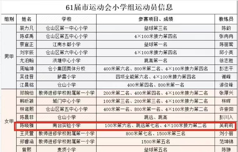 在刚刚结束的“福州市第61届中小学生田径运动会”中,我校的参赛选手六年6班的陈晓雅同学在此次大赛中荣获 4*100 米第二名、女子甲组100米第6名,女子甲组跳远第7名。载誉而归。学校对此竞赛中取得优异成绩的学生进行了表彰。
