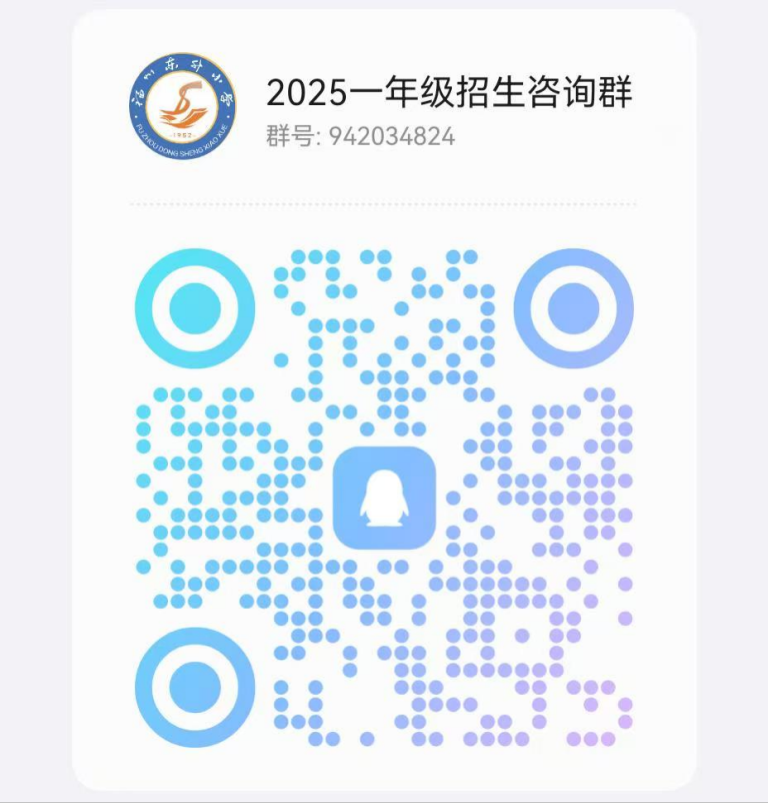 请2025年一年级报名学生家长扫码加入学校QQ群(相关招生文件及通知将在本群发布),每生一名家长加群即可。新生报名咨询QQ:942034824