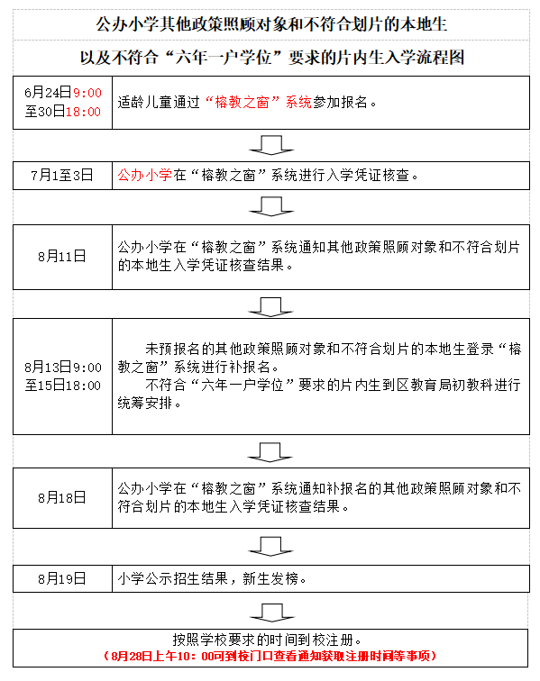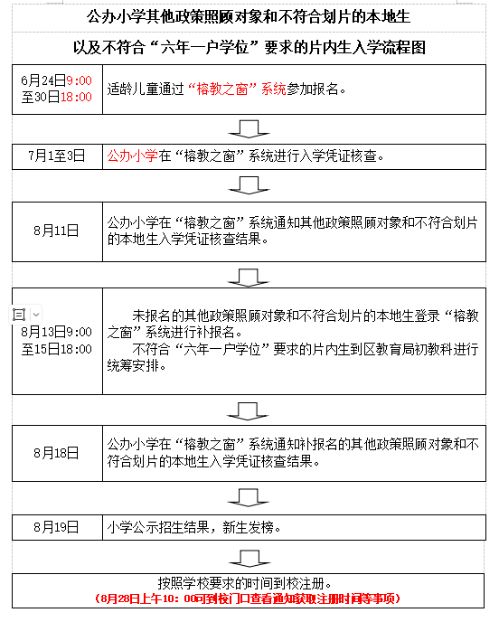 五、其他政策照顾对象和不符合划片的本地生以及不符合“六年一户学位”要求的片内生入学办法及流程图