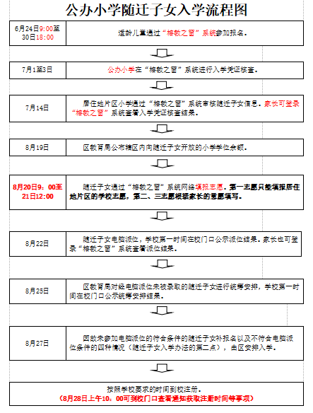 4.录取办法:(1)随迁子女志愿人数少于学校学位余额数时,学校应当全部予以录取。(2)志愿人数超过学位余额时,由区教育局通过电脑派位的方式确定学校的录取对象,在现行随迁子女“长幼随学”政策的基础上,多孩家庭随迁子女在同等条件下优先录取其哥哥(姐姐)所在学校,学校不得擅自接收未经过电脑派位录取的随迁子女入学。( 3)参加电脑派位未被录取以及符合条件因故未参加电脑派位的随迁子女,在电脑派位结束后将户籍新迁入本区的随迁子女,由区安排到有学位余额的公办学校就读。(随迁派位规则详见本文末)