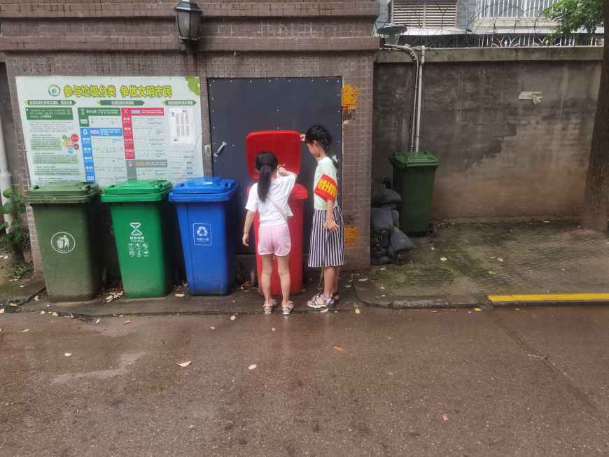 每天下午是住户扔垃圾的高峰期,小区垃圾桶边总有我校志愿者的身影。如有居民前来,他们都会认真对垃圾袋进行检查。发现垃圾混投现象,志愿者将帮助居民进行正确分类后投放。在没有住户前来投放时,志愿者们就检查并取出投错的垃圾,投放到正确的桶中。